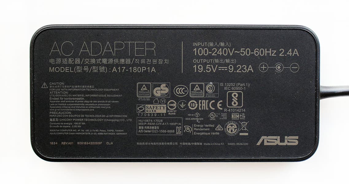 Asus ROG Zephyrus S GX502 комплектуется адаптером питания мощностью 180 Вт (19,5 В; 9,23 A).