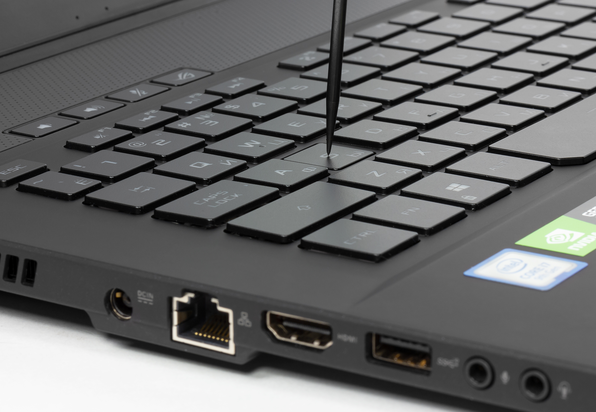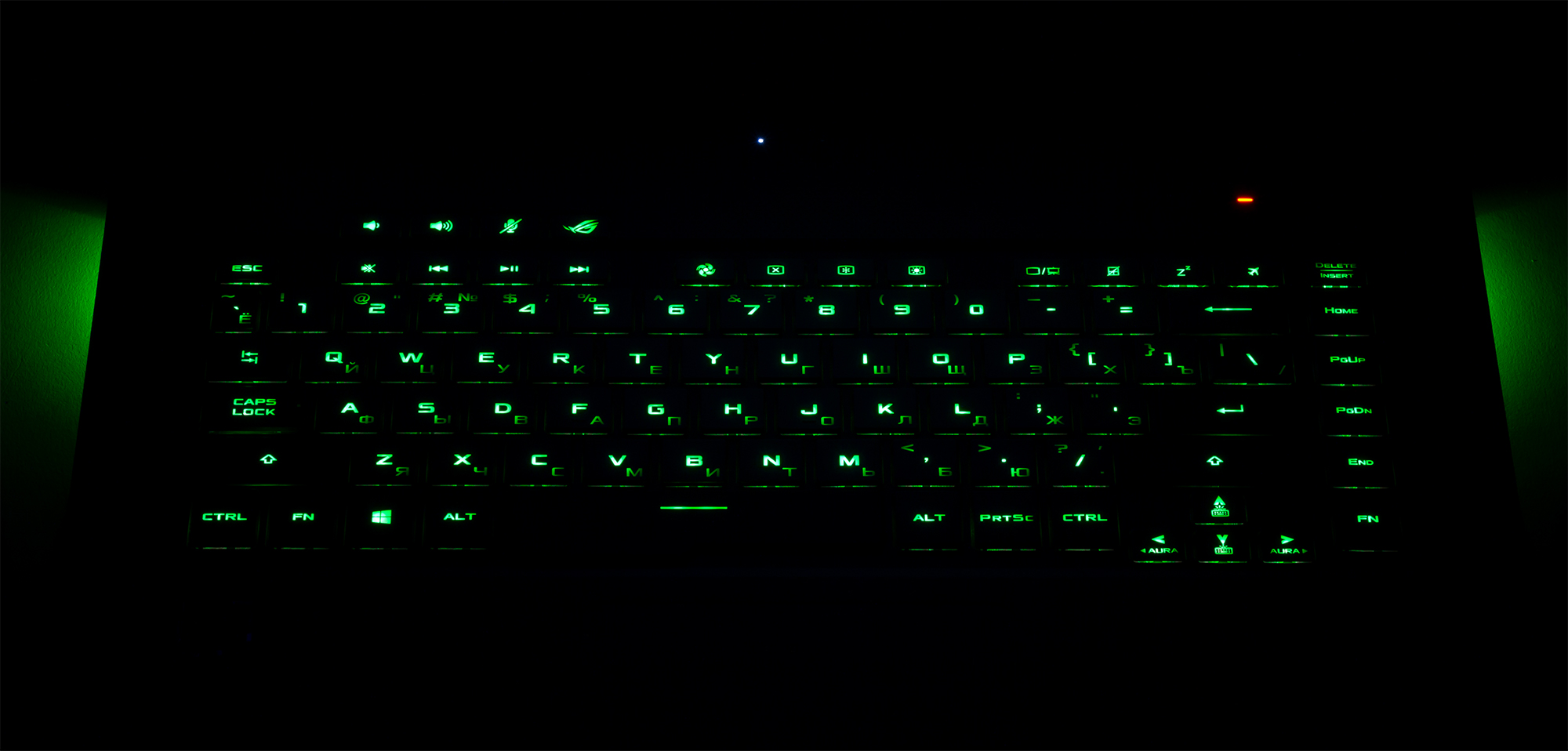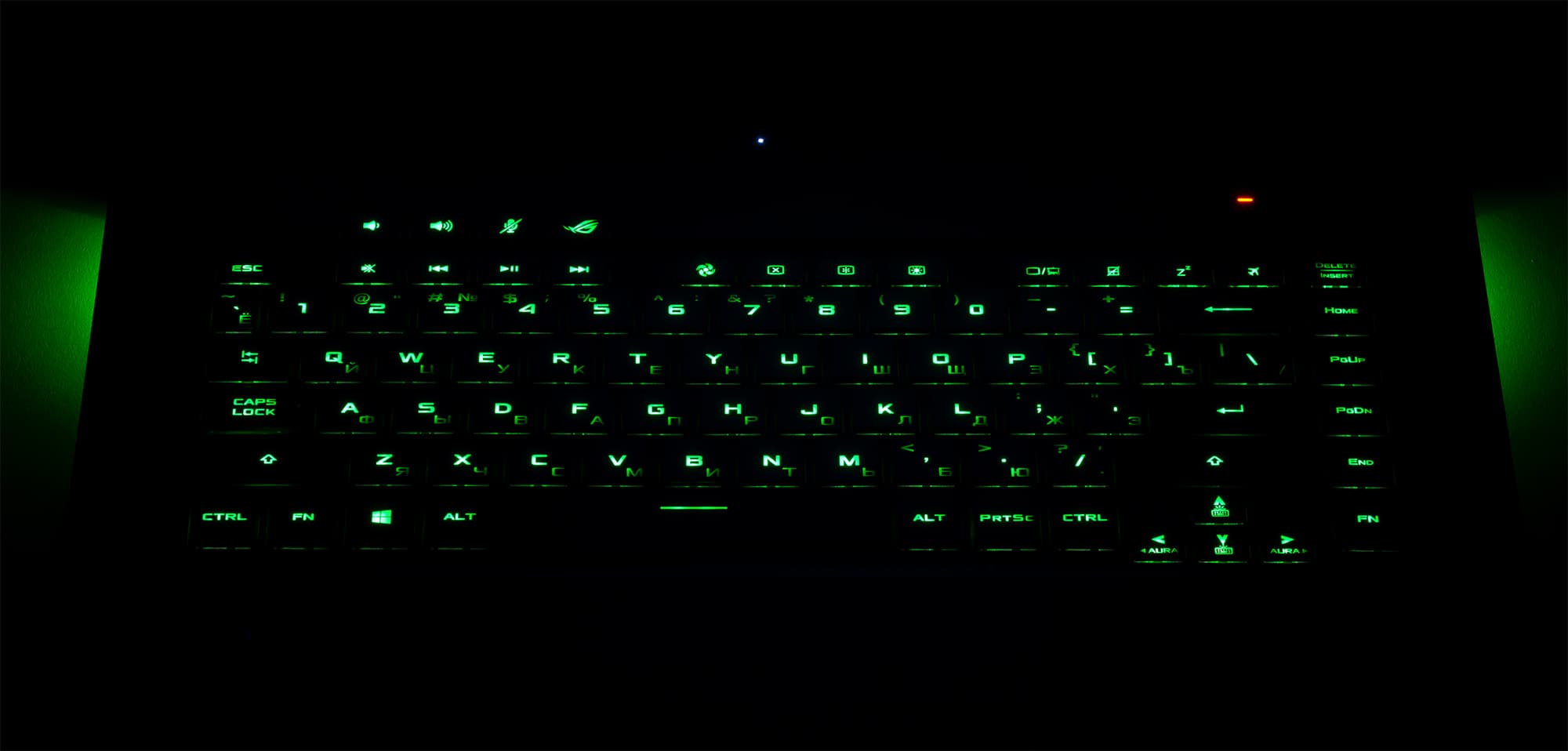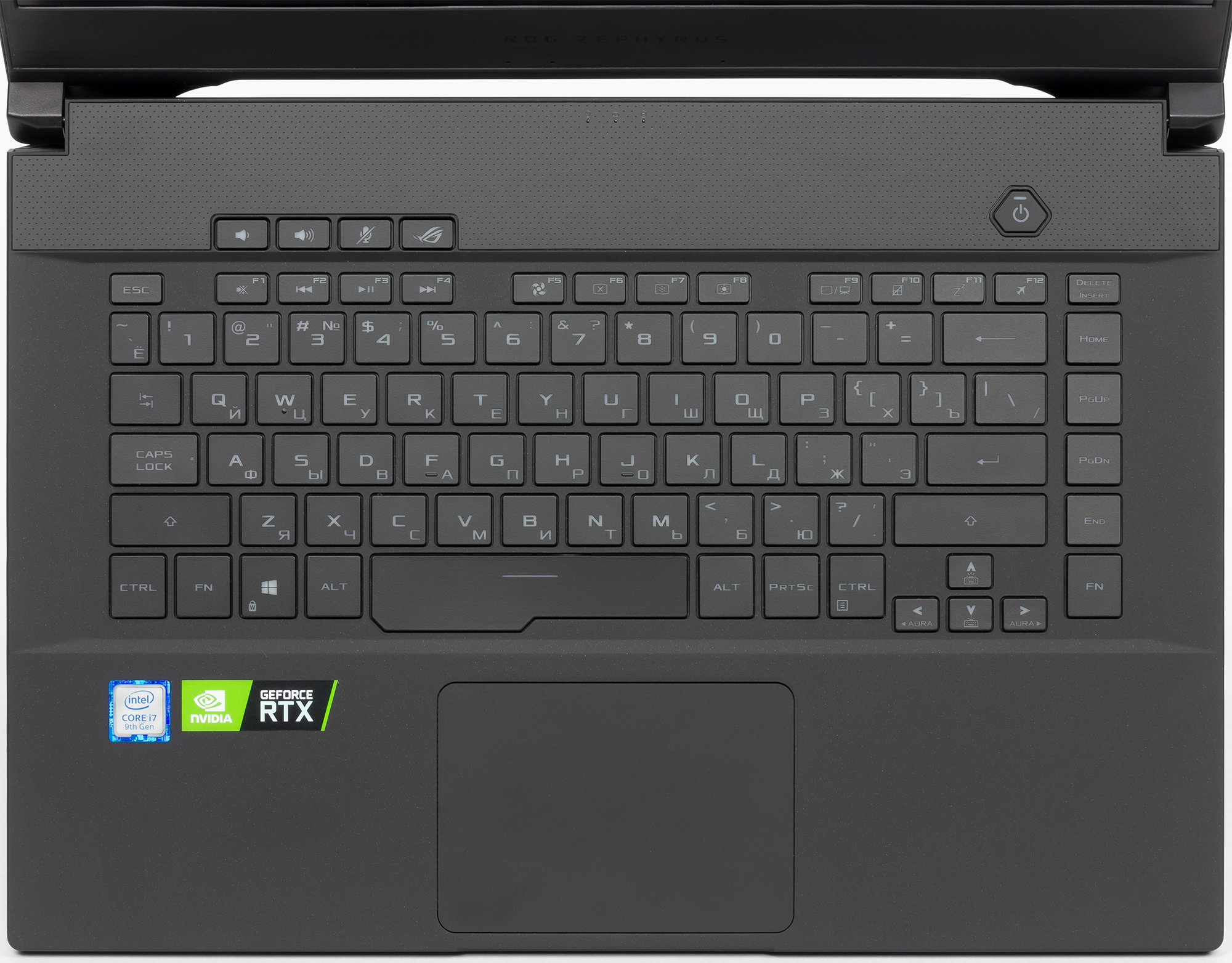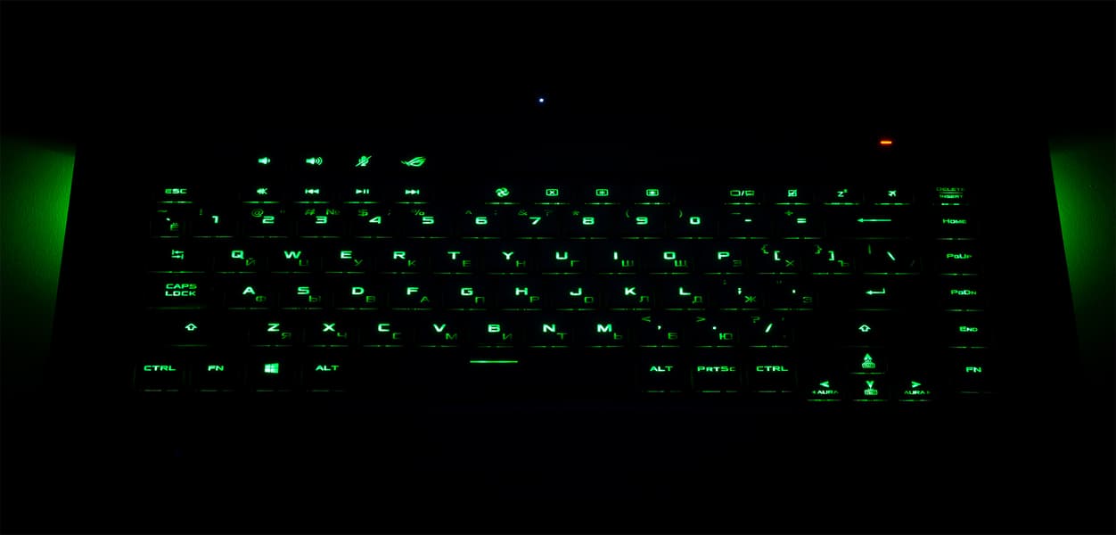 Рабочую зону ноутбука можно назвать классической, без блока цифровых клавиш. Из дополнительных независимых кнопок сверху размещены две кнопки регулировки громкости, кнопка включения или отключения микрофона, а также кнопка ROG Armoury Crate (выбор режимов работы ноутбука).