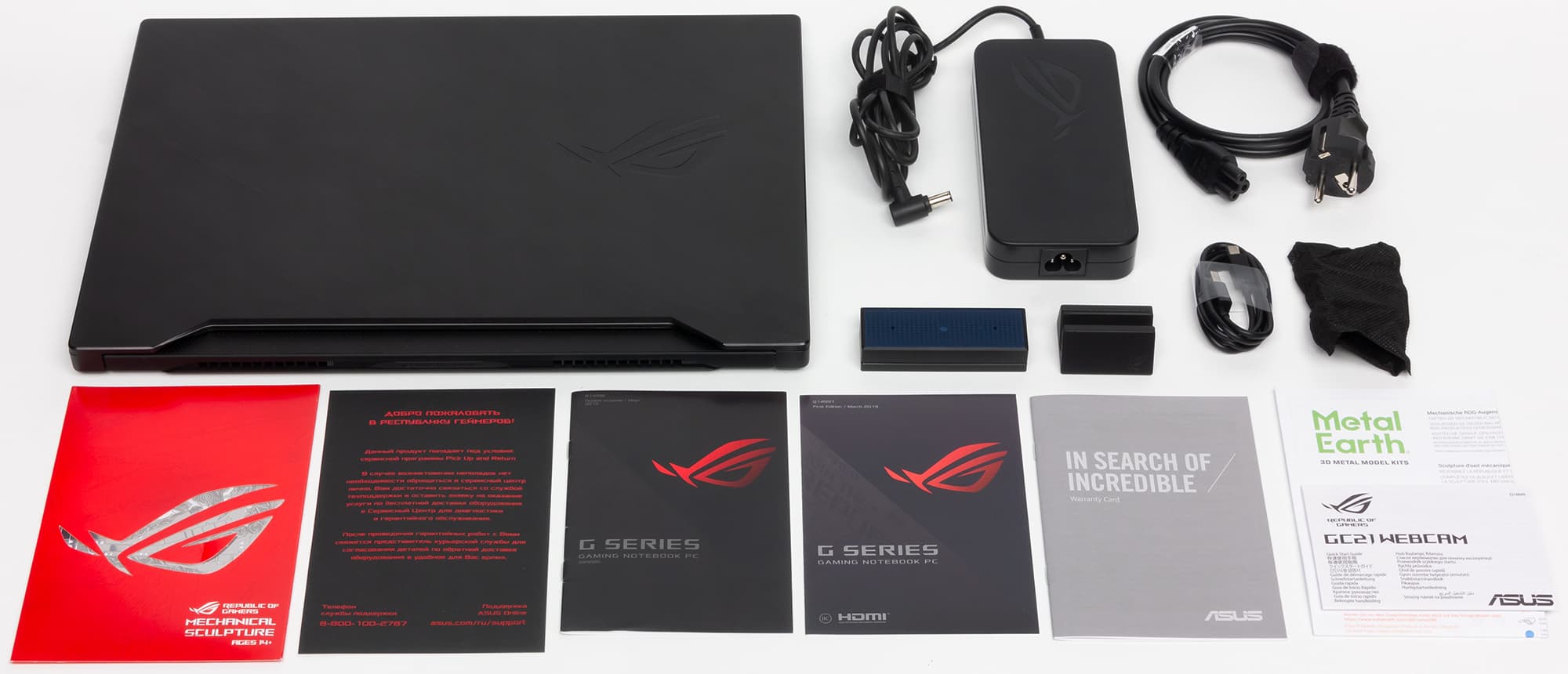 В ней и размещен ноутбук. В соседней картонной коробке можно найти блок питания с силовым кабелем, видеокамеру с держателем и USB-кабелем, а также различные инструкции и открытки ROG.