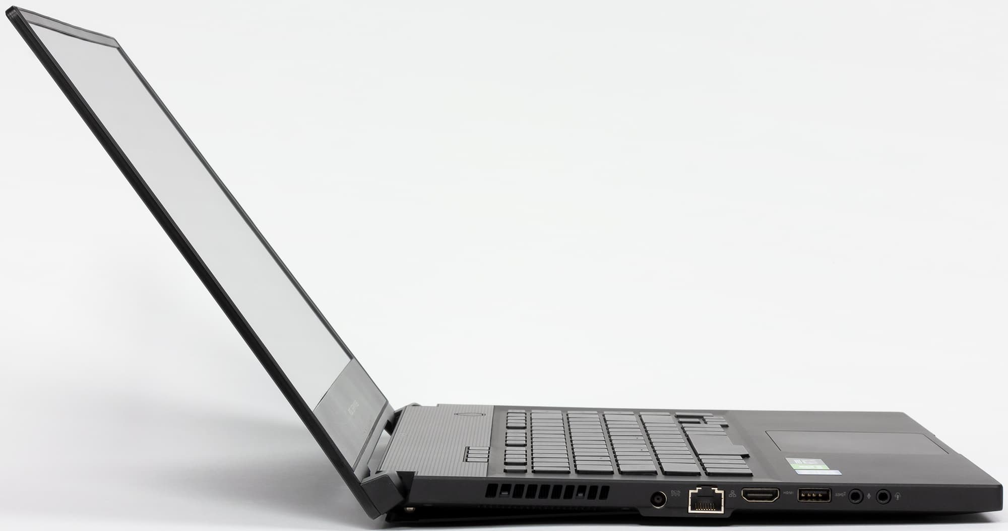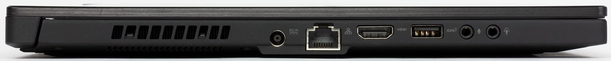 С левой боковой стороны ноутбука размещены вентиляционная решетка, разъем питания, сетевой разъем RJ-45, видеовыход HDMI 2.0, порт USB и разъемы для наушников и микрофона.