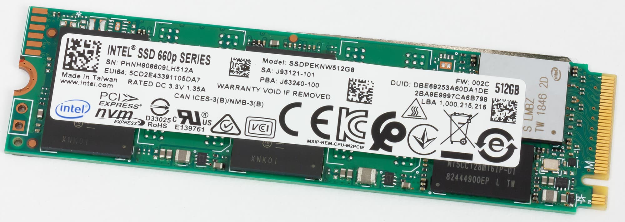 В нашей версии Asus ROG Zephyrus S GX502 оснащается одним SSD-накопителем, установленным в разъем M.2, объемом 512 ГБ. Причем на материнской плате ноутбука имеется еще один разъем M.2 для установки второго такого же накопителя с возможностью их объединения в режим RAID0. Накопитель выпущен компанией Intel, относится к серии 660p и имеет маркировку SSDPEKNW512G8.