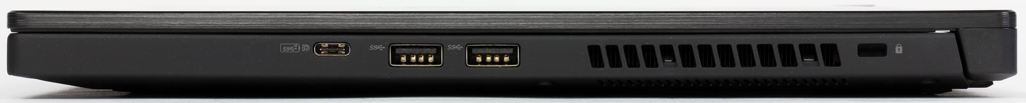 С правой стороны выведены три порта USB, включая Type-C, еще одна решетка для выброса из ноутбука нагретого воздуха и отверстие кенсингтонского замка.