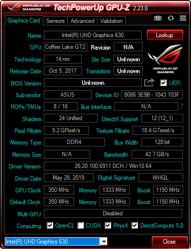 Вывод изображения в 2D-режимах обеспечивает встроенное в центральный процессор графическое ядро Intel HD Graphics 630.