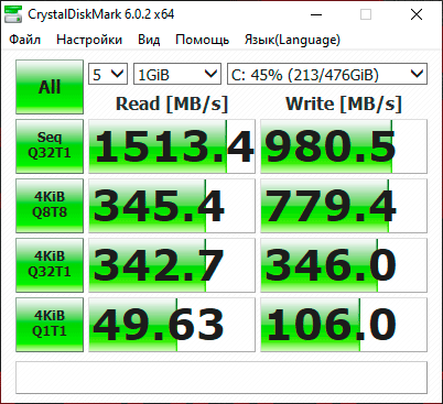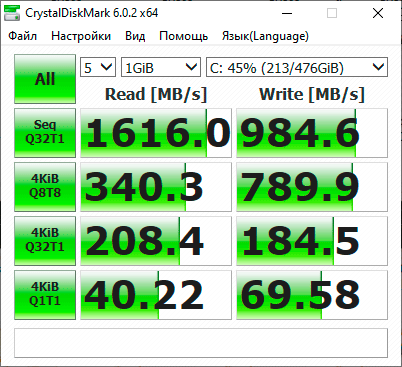 Только в двух последних режимах тестирования CrystalDiskMark видна разница между двумя вариантами работы ноутбука (в пользу, конечно же, электросети). В остальных дисковых бенчмарках SSD работает одинаково быстро.