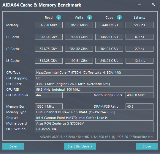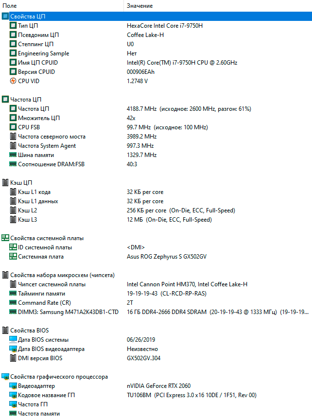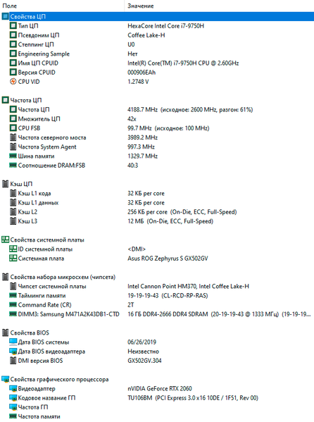 В нашей версии Asus ROG Zephyrus S GX502 установлено 32 ГБ памяти типа DDR4 с эффективной частотой 2667 МГц в двухканальном режиме.
