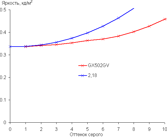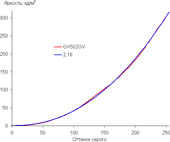 Аппроксимация полученной для настроек по умолчанию гамма-кривой дала показатель 2,18, что близко к стандартному значению 2,2, при этом реальная гамма-кривая несильно отклоняется от аппроксимирующей степенной функции: