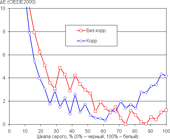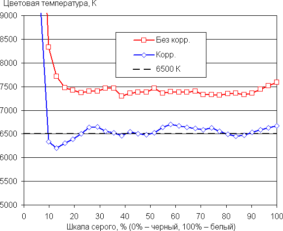 Баланс оттенков на шкале серого хороший, так как цветовая температура не сильно выше стандартных 6500 К, а отклонение от спектра абсолютно черного тела (ΔE) ниже 10, что для потребительского устройства считается приемлемым показателем. При этом цветовая температура мало изменяется от оттенка к оттенку — это положительно сказывается на визуальной оценке цветового баланса. (Самые темные области шкалы серого можно не учитывать, так как там баланс цветов не имеет большого значения, да и погрешность измерений цветовых характеристик на низкой яркости большая.)