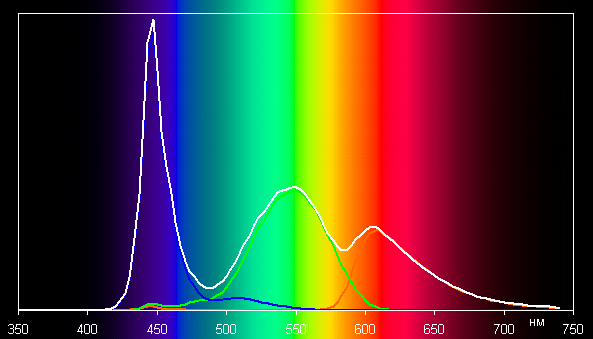 Поэтому визуально цвета на этом экране имеют естественную насыщенность. Ниже приведен спектр для белого поля (белая линия), наложенный на спектры красного, зеленого и синего полей (линии соответствующих цветов):