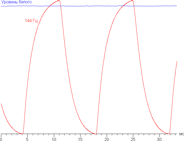 Однако никаких видимых артефактов мы не обнаружили. С нашей точки зрения, скорости матрицы достаточно даже для самых динамичных игр. В подтверждение приведем зависимость яркости от времени просто при выводе белого поля (Уровень белого), а также при чередовании белого и черного кадра при 144 Гц кадровой частоты: