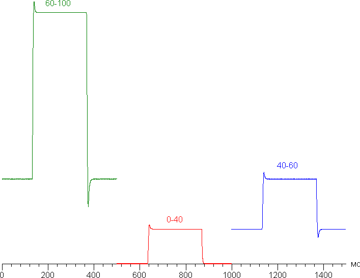 Время отклика при переходе черный-белый-черный равно 8,9 мс (4,1 мс вкл. + 4,8 мс выкл.), переход между полутонами серого в сумме (от оттенка к оттенку и обратно) в среднем занимает 7,9 мс. Матрица быстрая. Обеспечивается это в том числе за счет умеренного разгона — на графиках переходов между оттенками мы обнаружили характерные всплески яркости. Например, так выглядят графики для переходов между оттенками 60% и 100%, 0% и 40%, 40% и 60% (по численному значению оттенка):