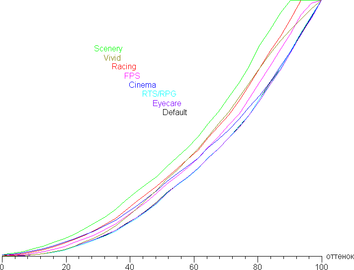 Правда, при этом в большинстве случаев уже в светах несколько самых светлых оттенков сольется с белым, что для игр обычно некритично. Ниже приведены гамма-кривые, построенные по 32 точкам для различных профилей: