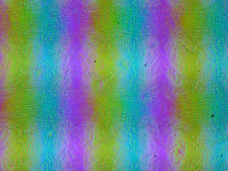 Зерно этих дефектов в несколько раз меньше размеров субпикселей (масштаб этих двух фотографий примерно одинаковый), поэтому фокусировка на микродефектах и «перескок» фокуса по субпикселям при изменении угла зрения выражены слабо, из-за этого нет и «кристаллического» эффекта.