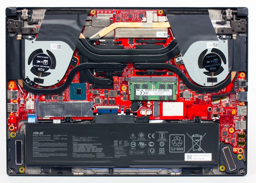 Наибольшую площадь здесь занимают система охлаждения и аккумулятор. В первой применены шесть плоских тепловых трубок, выполненных, конечно же, из меди. Они забирают тепло от центрального процессора, графического процессора видеокарты и элементов силовых цепей материнской платы, перекачивая тепловой поток на четыре независимых радиатора, общее число ребер в которых равно 205. Заявленная толщина медных ребер в радиаторах составляет всего 0,1 мм, а суммарная площадь теплорассеивания равна 110 000 мм².