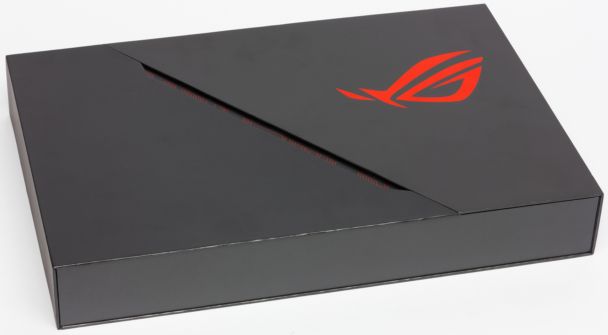 Asus ROG Zephyrus S GX502 поставляется в большой картонной коробке с пластиковой ручкой для переноски. Внутри коробки вставлены упоры из вспененного полиэтилена, между которыми зафиксирована дополнительная коробка с открывающимися вверх половинками крышки и логотипом серии ROG.
