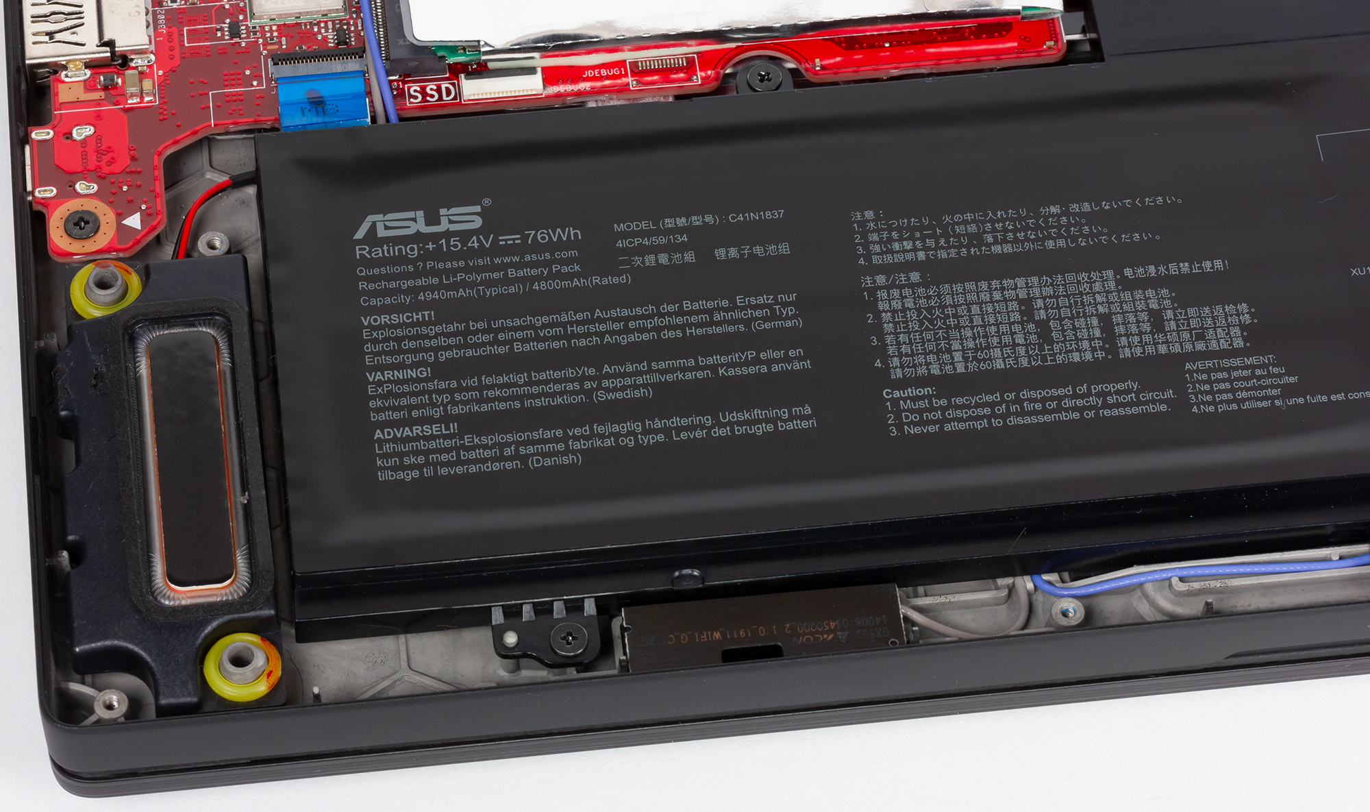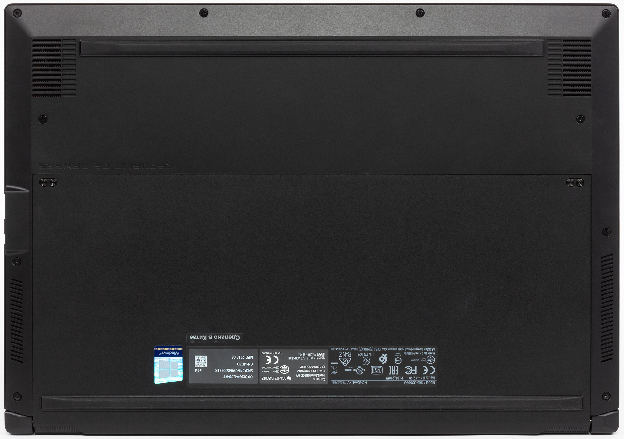 Нижняя панель Asus ROG Zephyrus S GX502 демонтируется целиком, благодаря чему будет открыт доступ практически ко всем компонентам ноутбука. Гарантия при этом, скорее всего, закончится.