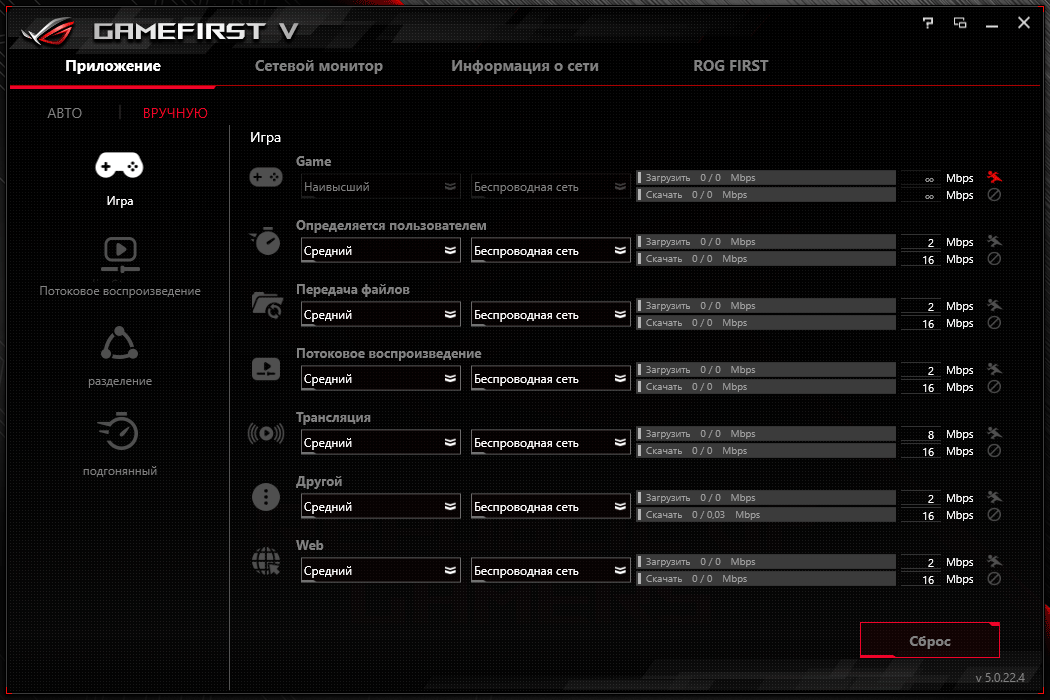 Всеми функциями можно управлять и через аналогичное мобильное приложение, позволяющее соединить смартфон или планшет с компьютером по Wi-Fi или Bluetooth. Кроме этого, отдельно отметим приложение ROG GameFirst V, с помощью которого можно предоставить отдельным приложениям максимальный приоритет при использовании сетевого канала в автоматическом или ручном режиме.