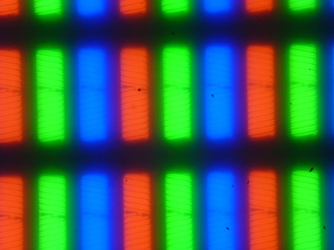В этом ноутбуке используется матрица типа IPS. Микрофотографии демонстрируют типичную для IPS структуру субпикселей (черные точки — это пыль на матрице фотоаппарата):
