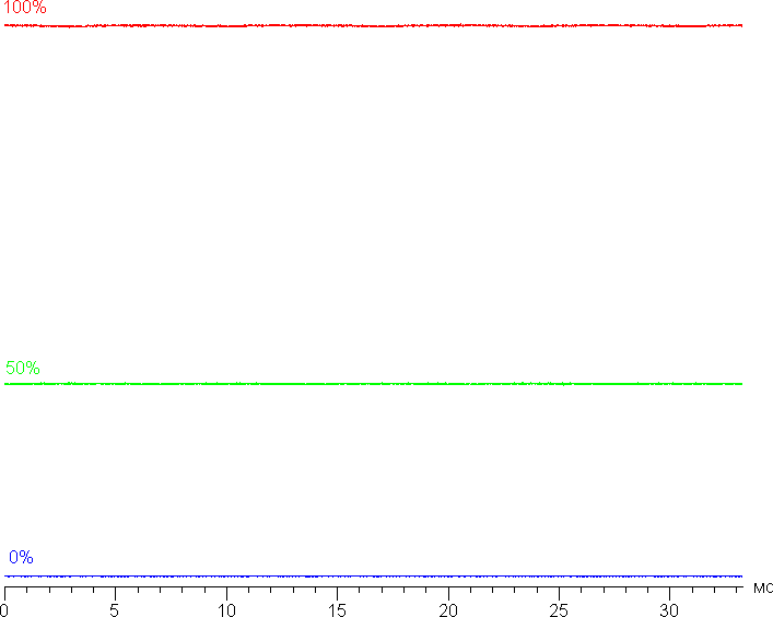 На любом уровне яркости значимая модуляция подсветки отсутствует, поэтому нет и никакого мерцания экрана. В доказательство приведем графики зависимости яркости (вертикальная ось) от времени (горизонтальная ось) при различных значениях настройки яркости: