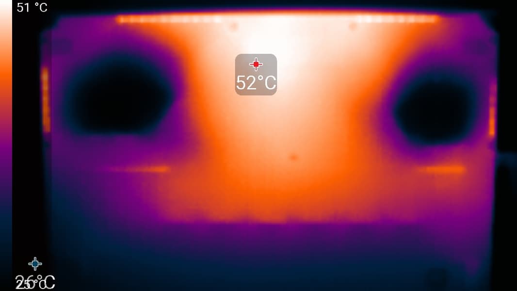 В заключение приведем термоснимки, полученные после долговременной работы ноутбука под максимальной нагрузкой на CPU и GPU (профиль Турбо):
