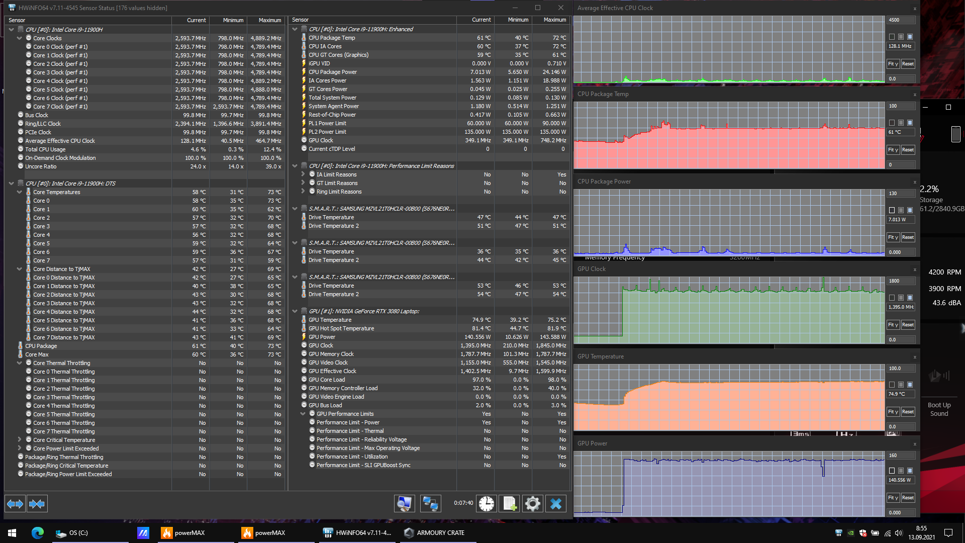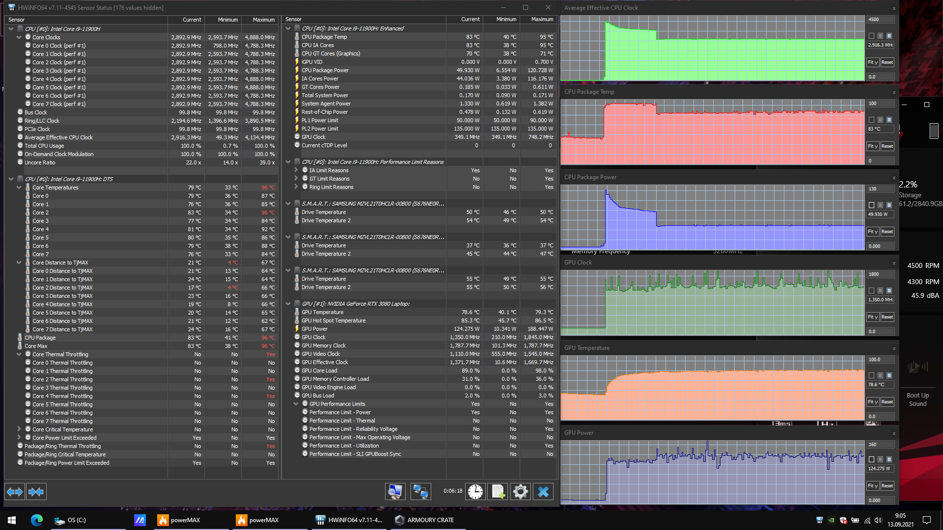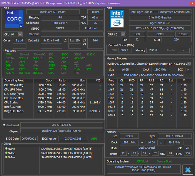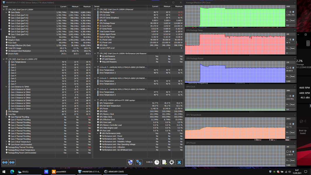 В ноутбуке используется 8-ядерный (16-поточный) топовый мобильный процессор Intel Core i9-11900H самого свежего 11-го поколения (Tiger Lake). Официальные частоты у него составляют 2,5/4,9 ГГц, а потребление может быть сконфигурировано в диапазоне 35—45 Вт. Однако на практике в тестируемом ноутбуке (как и в других топовых моделях, которые мы видели) процессор работает с гораздо более высоким потреблением — до 90 Вт в стабильном режиме. В процессор интегрировано графическое ядро UHD Graphics, но конечно, для игр (и приложений, умеющих задействовать GPU) используется дискретная видеокарта Nvidia GeForce RTX 3080 Laptop.