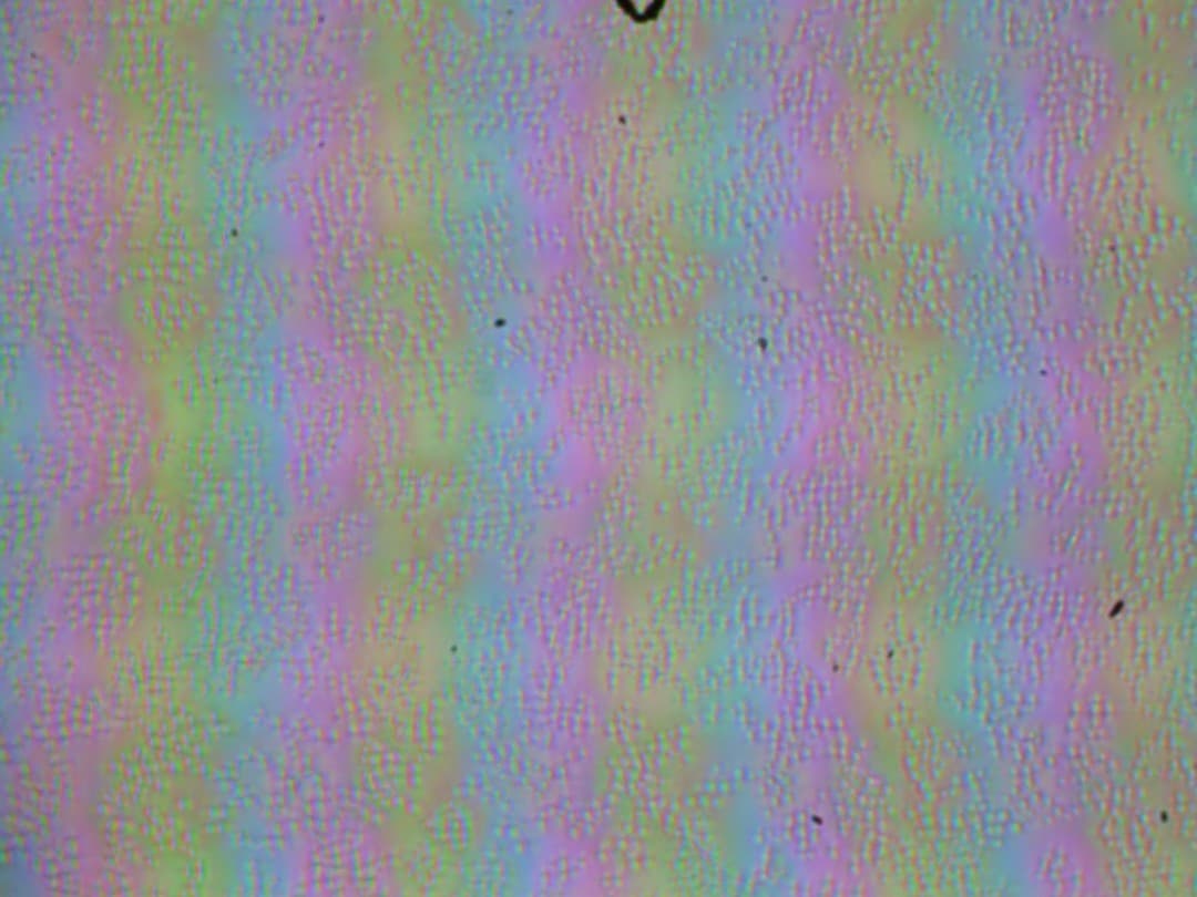 Зерно этих дефектов меньше размеров субпикселей (масштаб этих двух фотографий примерно одинаковый), но, видимо, они сгруппированы так, что в некоторой степени все равно есть фокусировка на микродефектах и «перескок» фокуса по субпикселям при изменении угла зрения. В итоге присутствует очень слабый «кристаллический» эффект и вариация яркости и цветового тона в масштабе нескольких пикселей.