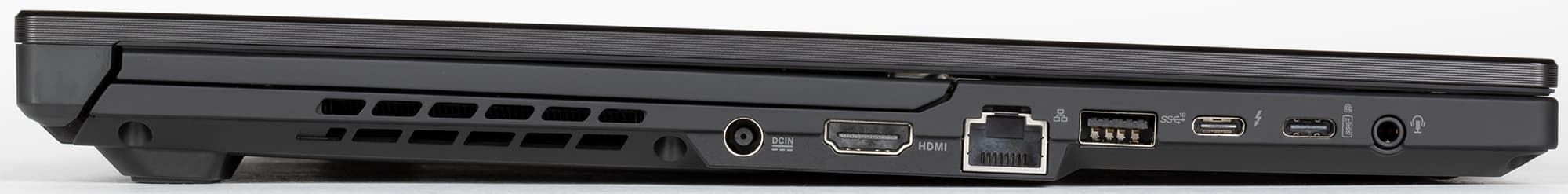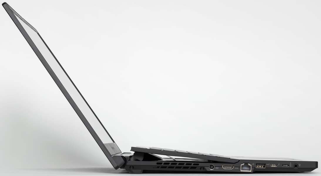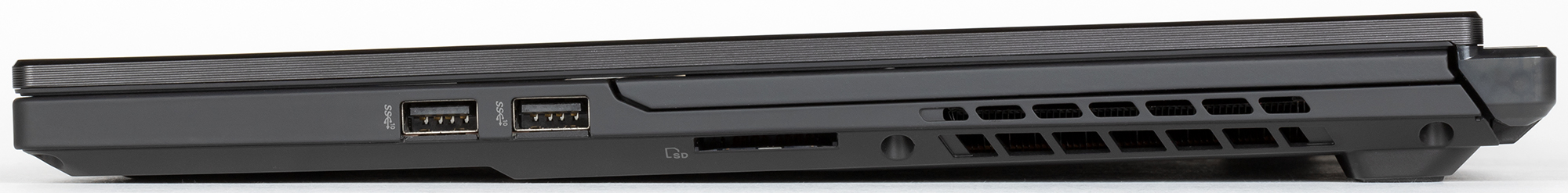 Там расположены разъем питания под фирменный круглый в сечении штекер, видеовыход HDMI, полноценная сетевая розетка RJ-45, порт USB3 Gen2 Type-A, два разъема USB3 Gen2 Type-C с богатыми возможностями и комбинированный миниджек (для гарнитуры). На правом боку разместились еще 2 порта USB3 Gen2 Type-A, а также картовод для карт SD. Один USB Type-C является на самом деле портом Thunderbolt 4 (это стандартная функциональность последнего поколения платформы Intel), он работает в том числе как видеовыход, позволяя подключать дисплеи с разрешением до 8K, также к нему можно подключать док-станции/репликаторы портов и многое другое — вопрос лишь в наличии на рынке и доступности таких устройств. Второй USB Type-C тоже поддерживает вывод видео (DisplayPort). Оба позволяют ускоренно заряжать подключенные к ним мобильные устройства (USB Power Delivery 3.0), а при подключении к ним адаптера питания ноутбук заряжается сам. Все USB-порты поддерживают скоростной режим передачи данных 10 Гбит/с.