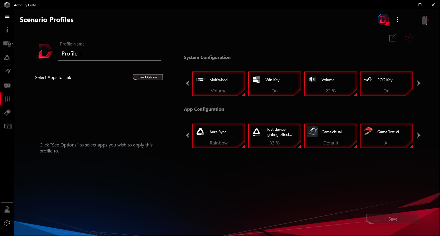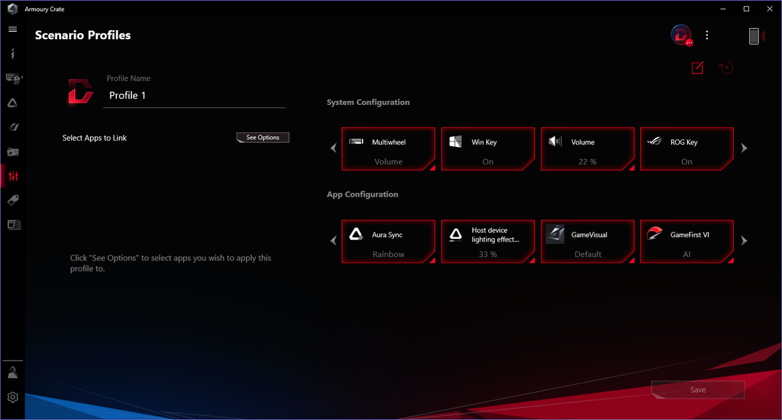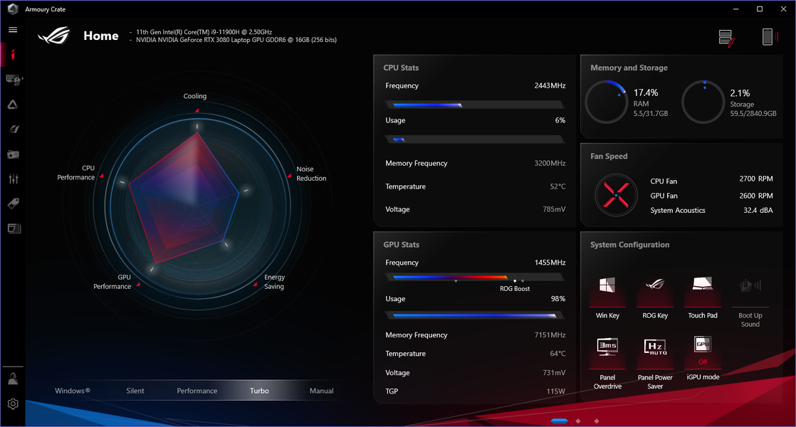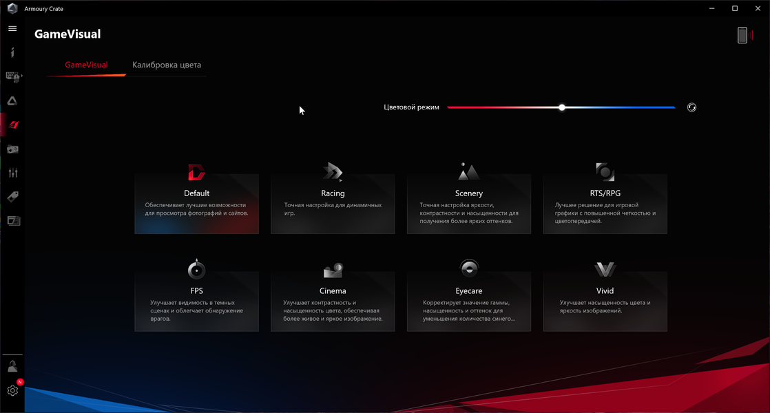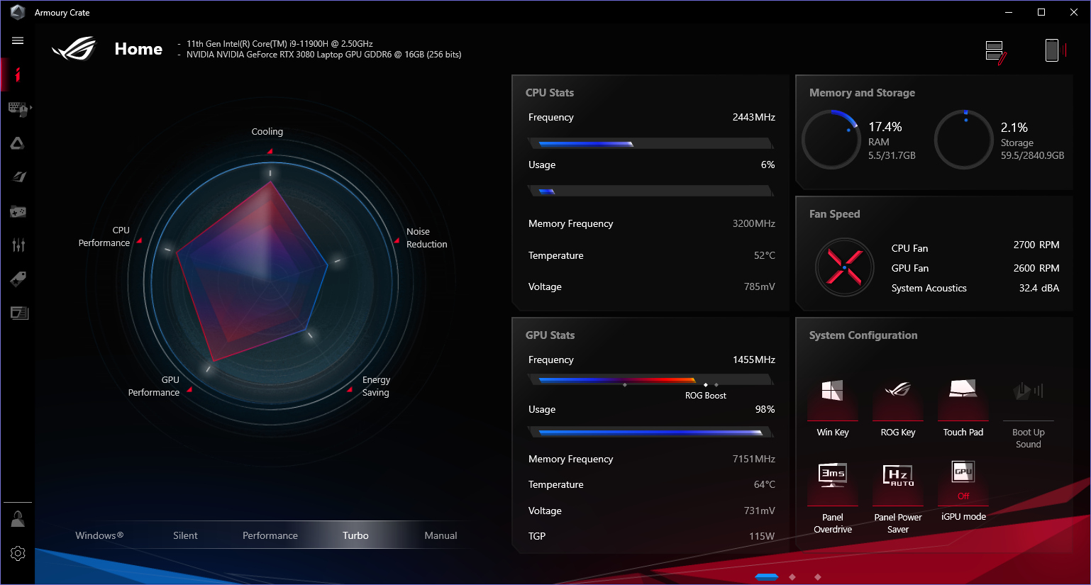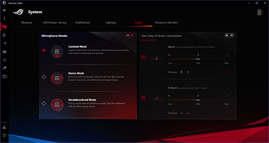 Armoury Crate отвечает за настройку аппаратной части. Эту утилиту можно быстро запустить, нажав выделенную кнопку в нижнем ряду клавиатуры за тачпадом. Главная функция Armoury Crate — переключение профилей работы, определяющих производительность и шум ноутбука. Из дополнительных возможностей отметим вывод информации о работе кулеров (на момент тестирования это был единственный способ); быстрое включение/отключение кнопок Win и ROG, тачпада и звука при загрузке системы; наглядный мониторинг низкоуровневых параметров, обновление пакета фирменных утилит. В случае работы от батареи можно автоматически снижать частоту обновления экрана и отключать дискретную видеокарту, чтобы экономить энергию.