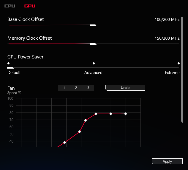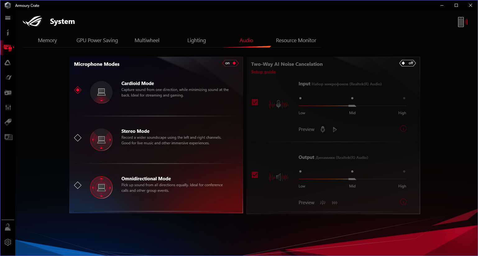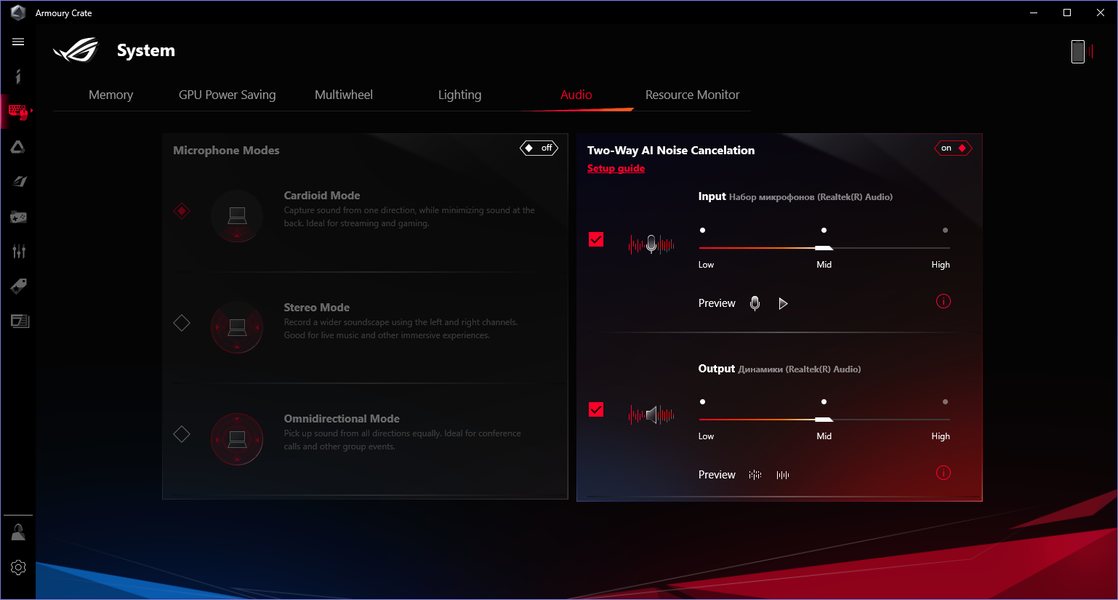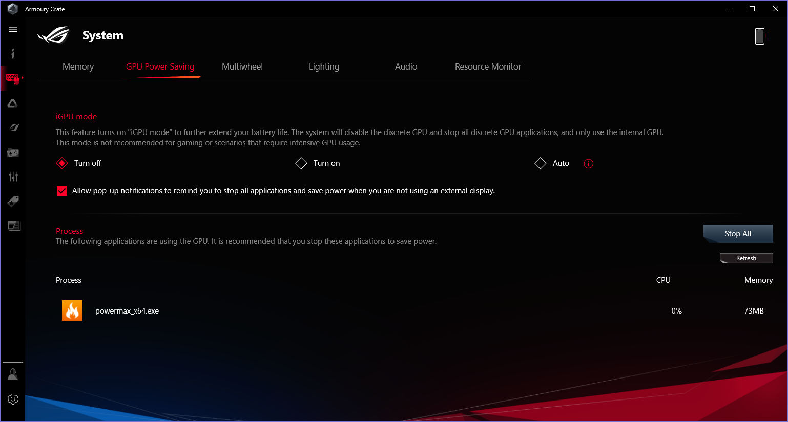 Armoury Crate отвечает за настройку аппаратной части. Эту утилиту можно быстро запустить, нажав выделенную кнопку в нижнем ряду клавиатуры за тачпадом. Главная функция Armoury Crate — переключение профилей работы, определяющих производительность и шум ноутбука. Из дополнительных возможностей отметим вывод информации о работе кулеров (на момент тестирования это был единственный способ); быстрое включение/отключение кнопок Win и ROG, тачпада и звука при загрузке системы; наглядный мониторинг низкоуровневых параметров, обновление пакета фирменных утилит. В случае работы от батареи можно автоматически снижать частоту обновления экрана и отключать дискретную видеокарту, чтобы экономить энергию.