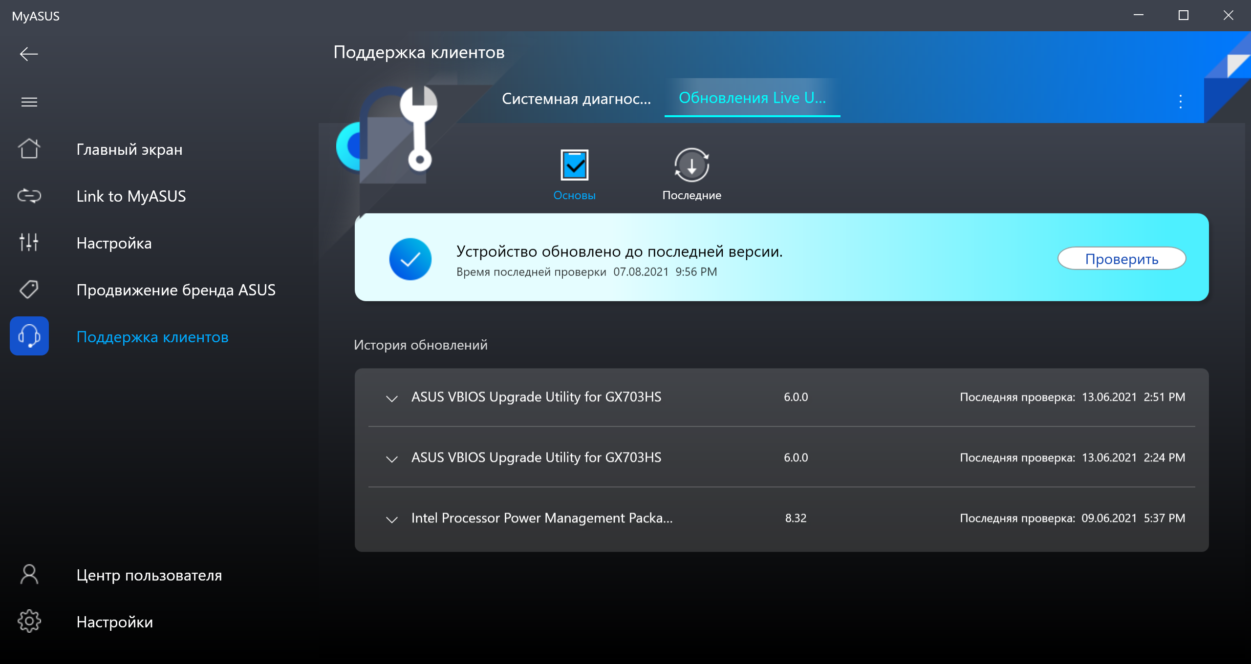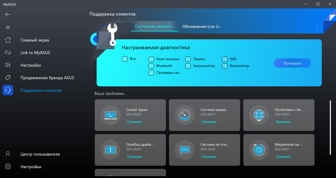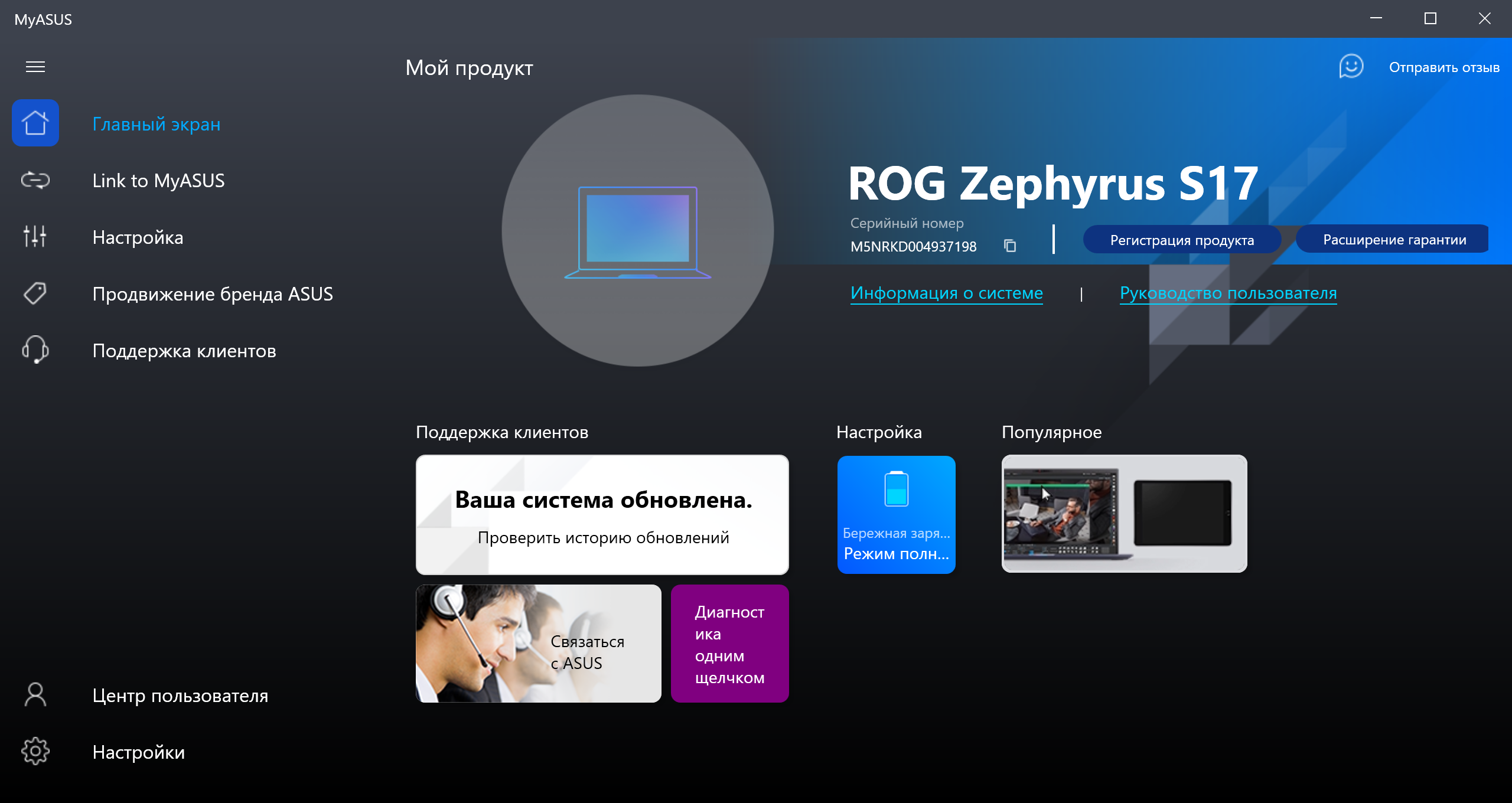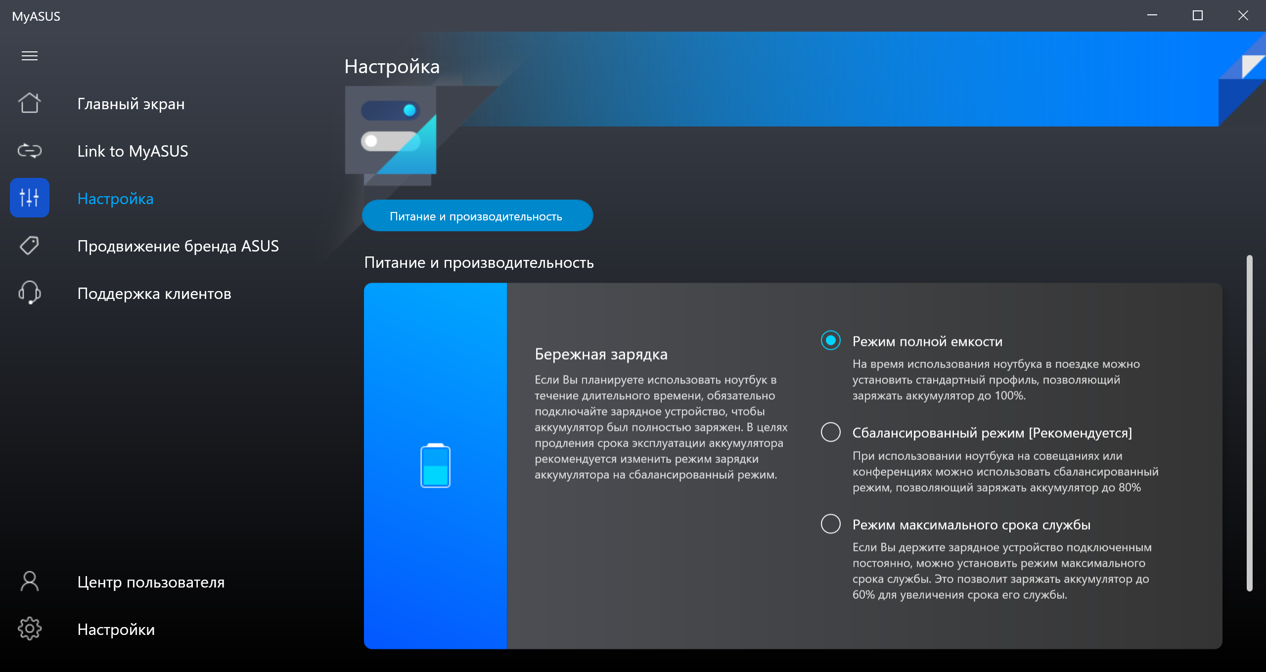MyAsus — это сборник информации о системе, средств диагностики, контактов техподдержки, часто задаваемых вопросов и т. д. Также утилита позволяет следить за обновлениями драйверов и фирменного ПО. Из интересных нам связок с аппаратными особенностями — возможность включить режим продления службы батареи, заряжая ее не полностью (до 60%/80%/100%), если вам не требуется долгая автономная работа.