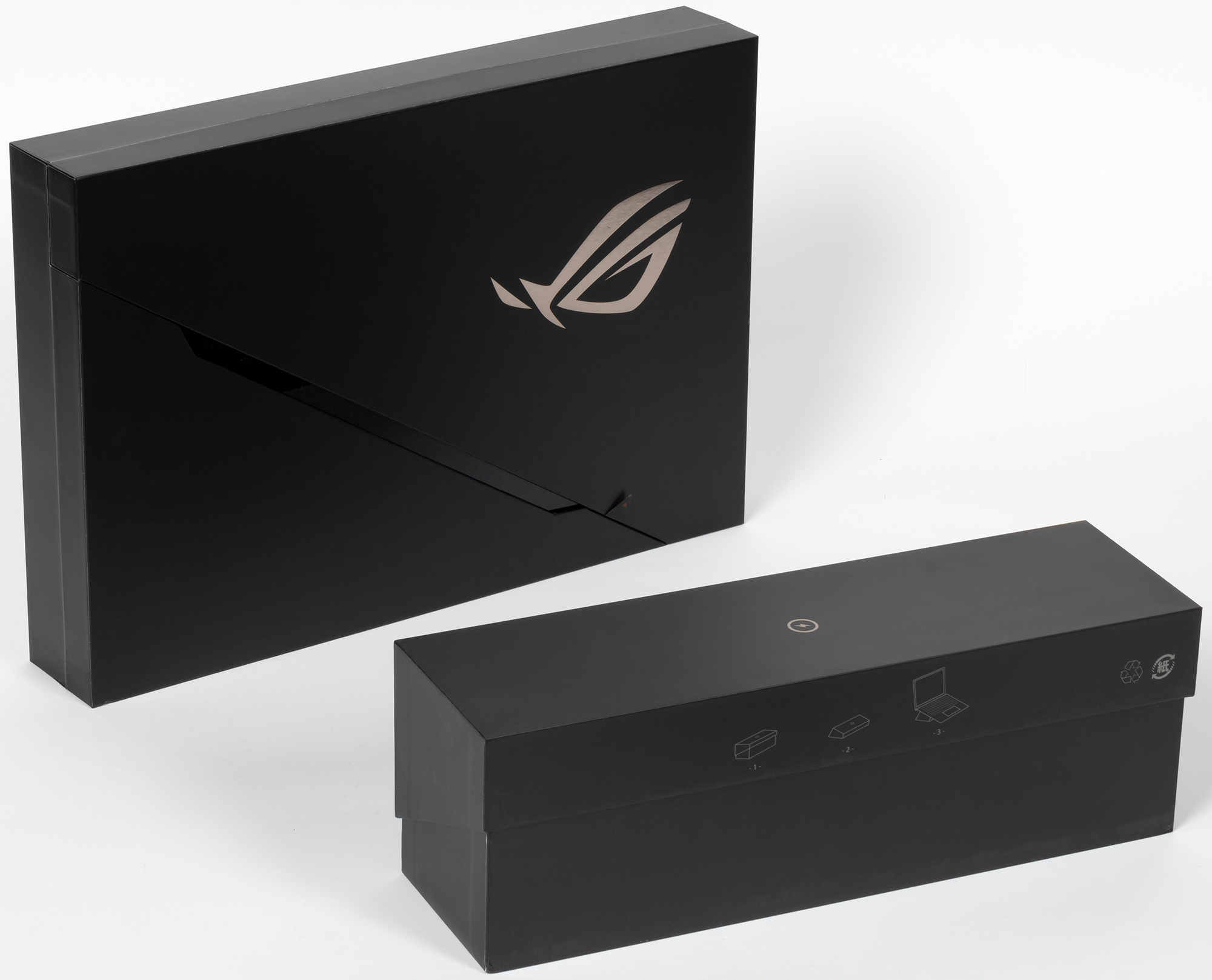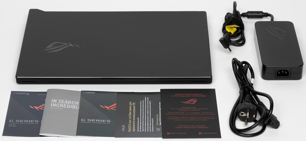 Ноутбук поставляется в традиционной коробке с ручкой для переноски, а вот внутренняя коробка здесь необычная, она раскладывается нестандартно (в стороны из середины). В комплекте идут большой и тяжелый адаптер питания на 280 Вт (844 г) и бумажная документация.