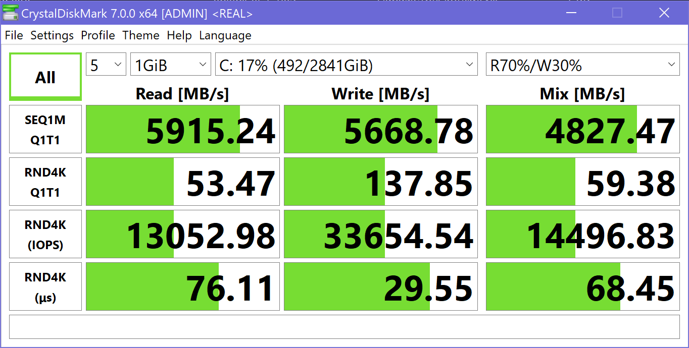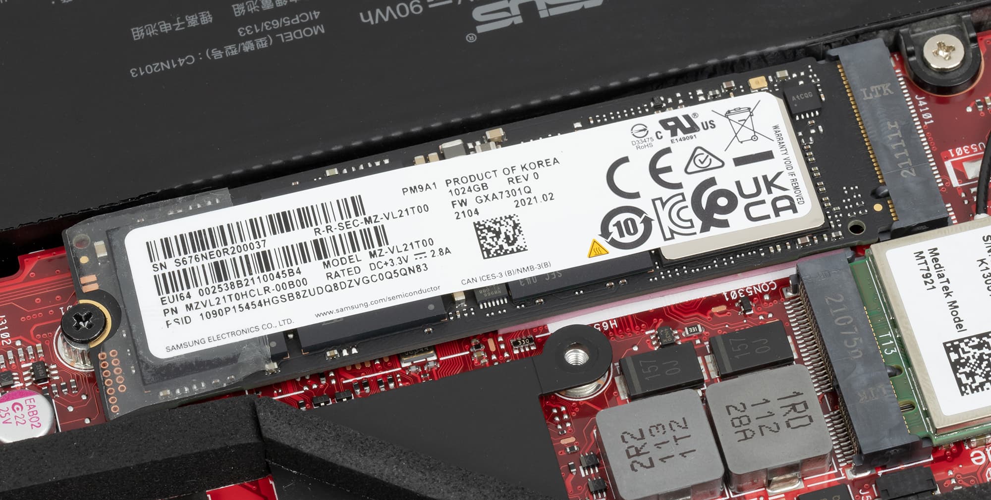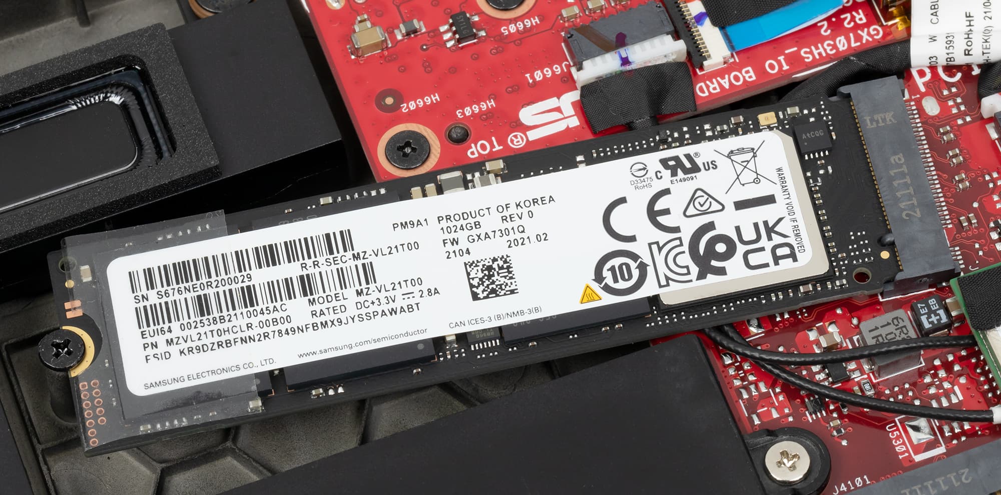 Прежде чем перейти к тестам, посмотрим на накопитель. Такой накопитель на нашей памяти еще не встречался: это даже не два SSD в RAID0-массиве — это три SSD в RAID0-массиве! Массив собран из одинаковых терабайтных NVMe SSD Samsung PM9A1 с интерфейсом PCIe 4.0 — это, кажется, первая сколько-нибудь распространенная ноутбучная модель с таким интерфейсом. Впрочем, само по себе новое поколение интерфейса PCIe практически ничего не дает, он и так был избыточен. К тому же, только один SSD установлен в слот M.2, подключенный к процессору — по интерфейсу PCIe 4.0. Два других слота M.2 подключены к чипсету и работают с PCIe 3.0, а особенности создания RAID-массива требуют, чтобы скорость всех трех слотов была одинаковой, поэтому в реальности на скорости PCIe 4.0 тут ничего не работает. Тем не менее, массив с чередованием из трех очень быстрых SSD все равно позволяет установить рекорд линейной скорости чтения и записи, который вряд ли будет побит в ближайшее время.