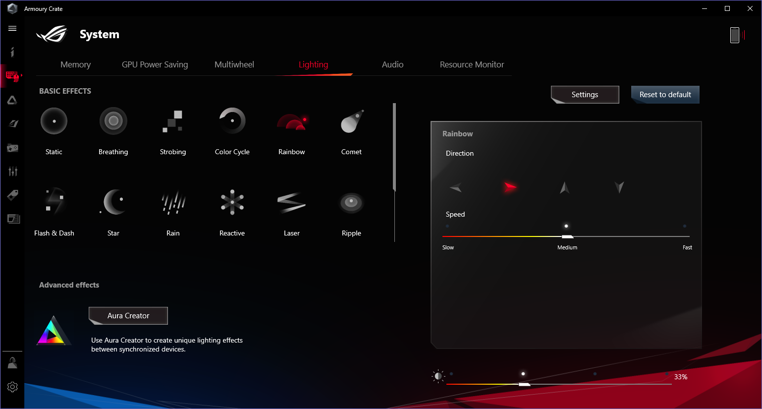 Разумеется, в фирменной утилите Armoury Crate есть управление/синхронизация подсветки, можно выбрать один из многих готовых режимов и настроить его параметры. Также можно быстро перебирать схемы и менять яркость подсветки прямо с клавиатуры. А еще можно запустить отдельную утилиту Aura Creator, где создание своих сценариев работы подсветки выведено уже почти на уровень видеоредактора. Подчеркнем, что с помощью фирменных утилит можно синхронизировать подсветку всех компонентов Asus с поддержкой Aura, в данном случае это может быть актуально, например, для объединения в единое световое пространство с ноутбуком еще гарнитуры и мышки.