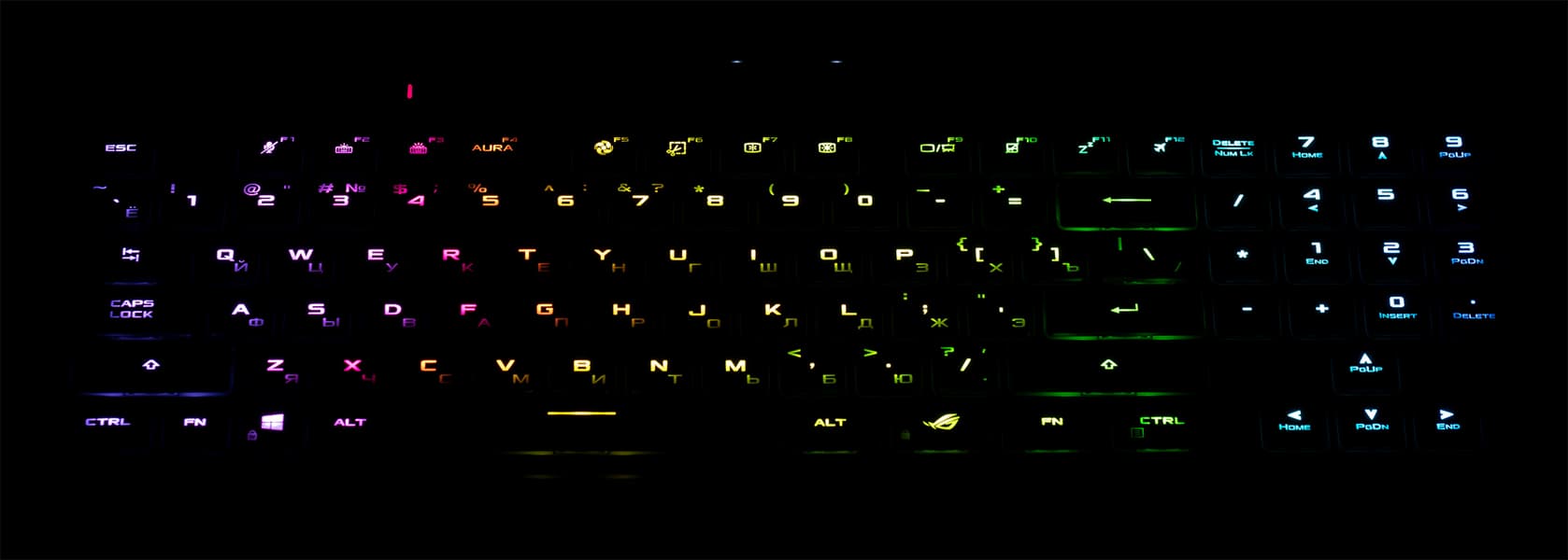 При первом практическом знакомстве с клавиатурой вас ждет еще одна неожиданность: она не мембранная. Да, выпускались модели игровых ноутбуков с механической клавиатурой, но это как минимум большая редкость. Честно говоря, поначалу очень непривычно: тыкая в кнопку, ожидаешь характерного упругого сопротивления мембраны, вместо этого клавиша неожиданно проваливается с характерным же щелчком. Ни ход, ни громкость щелчка нельзя сравнить с типичными отдельными механическими клавиатурами — впрочем, сейчас существует достаточно разновидностей свитчей, чтобы не грести их все под одну гребенку. В целом нажатие требуется более легкое, чем у типовой мембранной ноутбучной клавиатуры, а шум нажатия слышен гораздо более отчетливо, и избежать его невозможно (опять же, в отличие от мембранной) — при наборе текста ноутбук характерно стрекочет. Нажатие ощущается очень хорошо, обратная связь отличная. Ход клавиш, по данным Asus, составляет 1,9 мм, наши измерения показали, скорее, 1,7 мм, но это все равно больше, чем в типичных ноутбучных клавиатурах. Клавиши имеют стандартную форму, плоскую поверхность, островное расположение. Также упомянем, что обработка нажатий осуществляется независимо (n-key rollover), то есть сколько одновременно кнопок ни нажимай в пылу сражения, игра отреагирует на все.