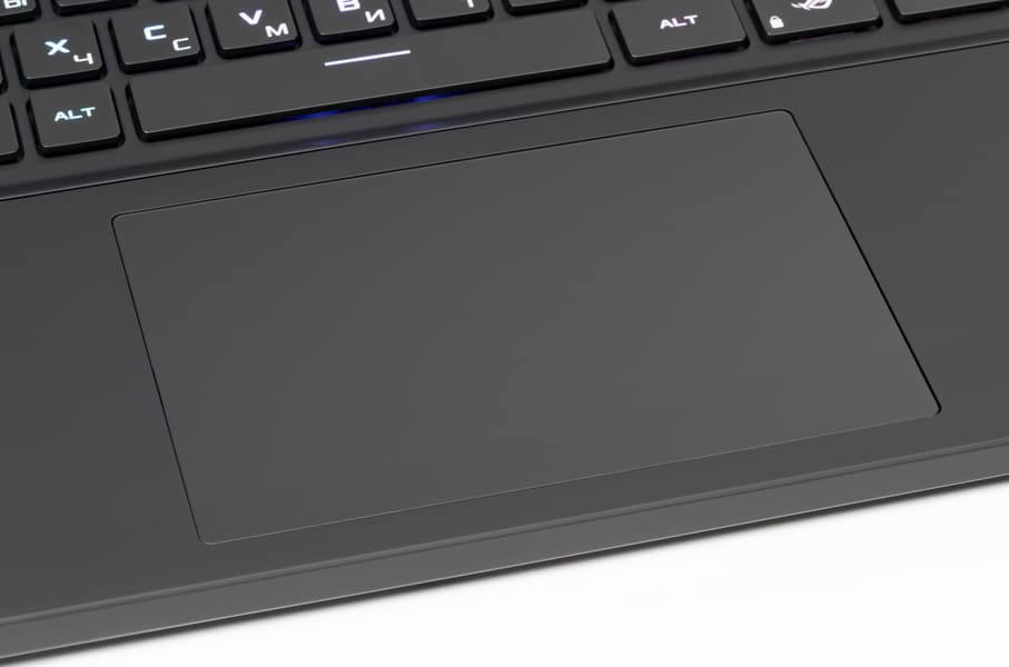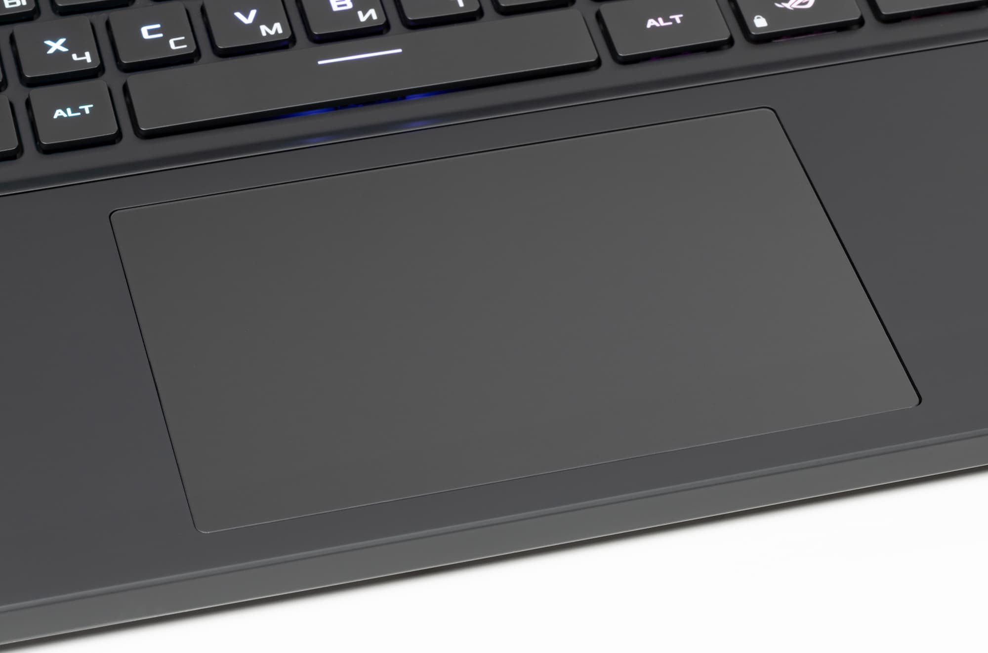 Тачпад, расположенный в традиционном месте перед клавиатурой, уверенно можно назвать большим (130×85 мм), на нем можно с комфортом чертить, например, 4-пальцевые горизонтальные жесты. Самый дальний край сенсорной поверхности не нажимается, но по всей остальной площади нажатие достаточно равномерное. Физических кнопок у тачпада нет, но нажатие справа у ближнего края воспринимается как нажатие правой кнопки мыши, нажатие или касание в любой другой области — как нажатие левой кнопки мыши.
