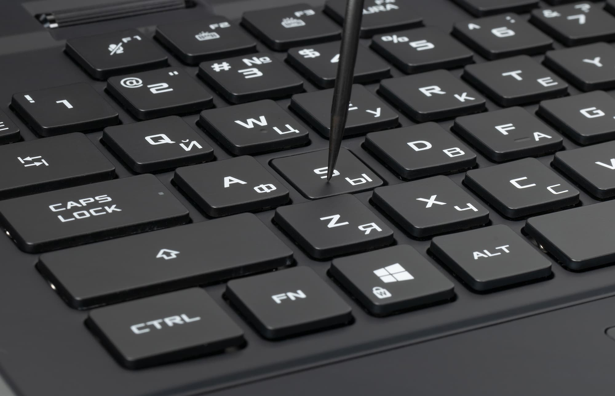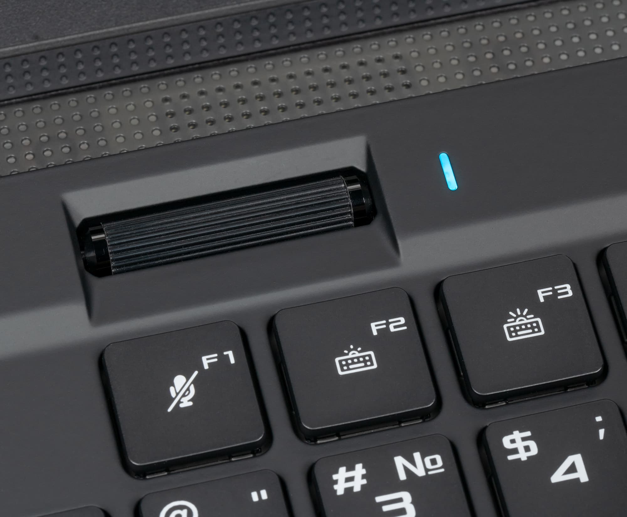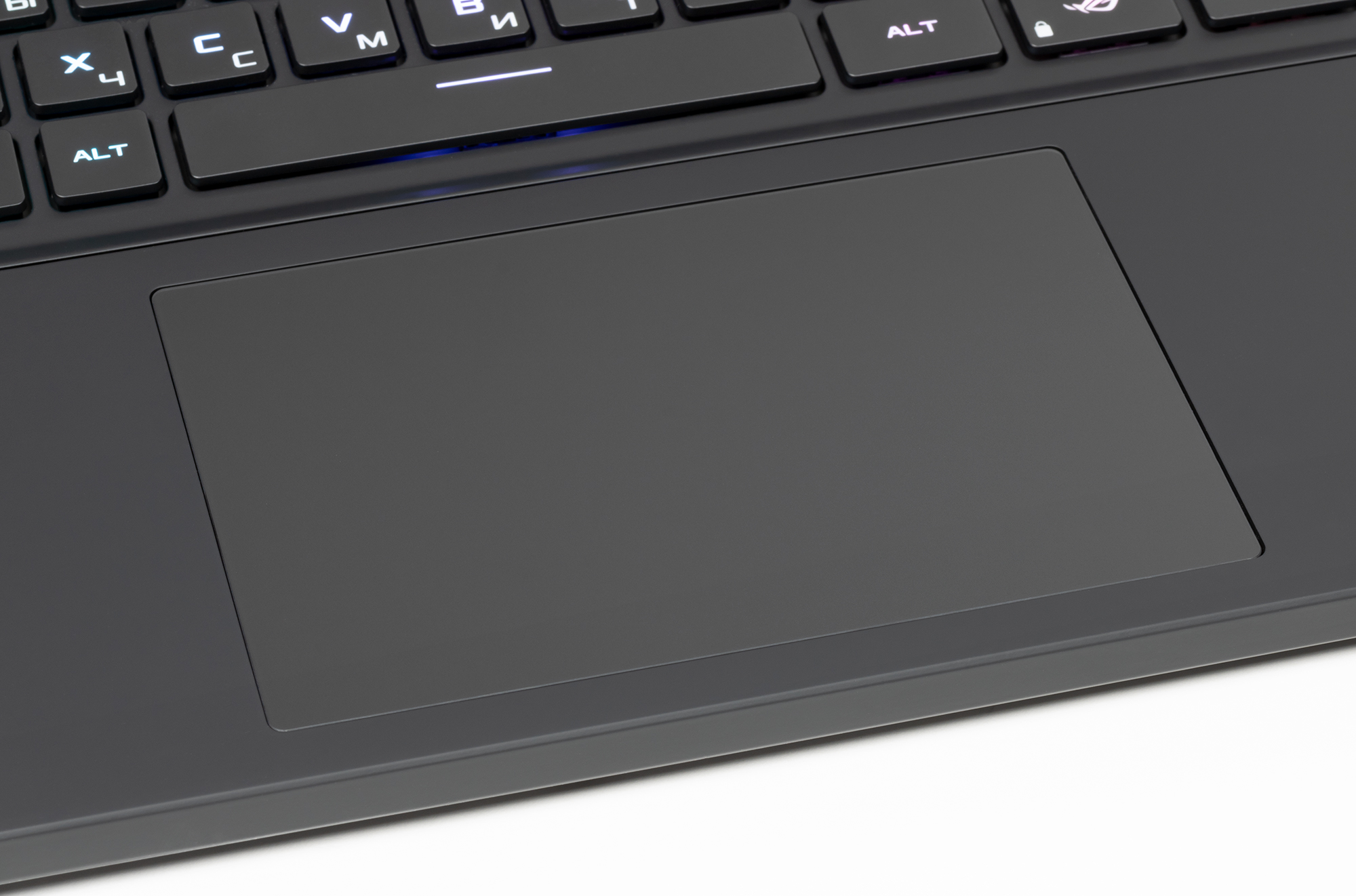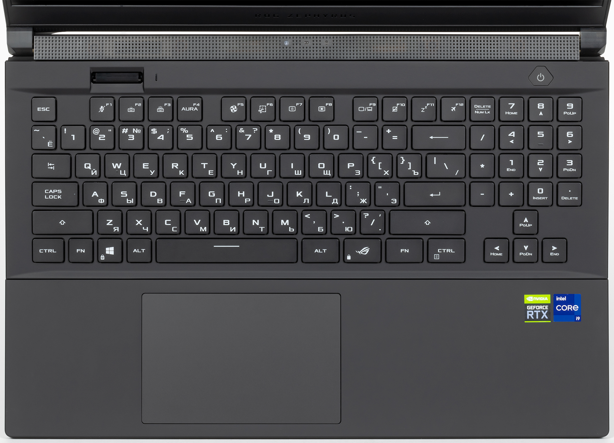 Что еще можно заметить по раскладке? В основной части она, в принципе, стандартная в хорошем смысле: всё на своих местах, кнопки достаточно большие (15,5×15,5 мм, 4 мм между краями), Ё не заужена, в верхнем ряду кнопки полноразмерные, а не ужатые по высоте, и разбитые на четверки. В нижнем ряду всего одна кнопка Win, зато две Fn (удобно брать аккорды) и есть кнопка ROG для запуска фирменной утилиты Armoury Crate. Кнопка питания вынесена за пределы клавиатуры, имеет нестандартную форму и выполнена заподлицо с рабочей поверхностью, так что случайные нажатия практически исключены. В нее интегрирован сканер отпечатков пальцев, в том числе позволяющий одним касанием вернуться к работе с ноутбуком после открытия крышки.