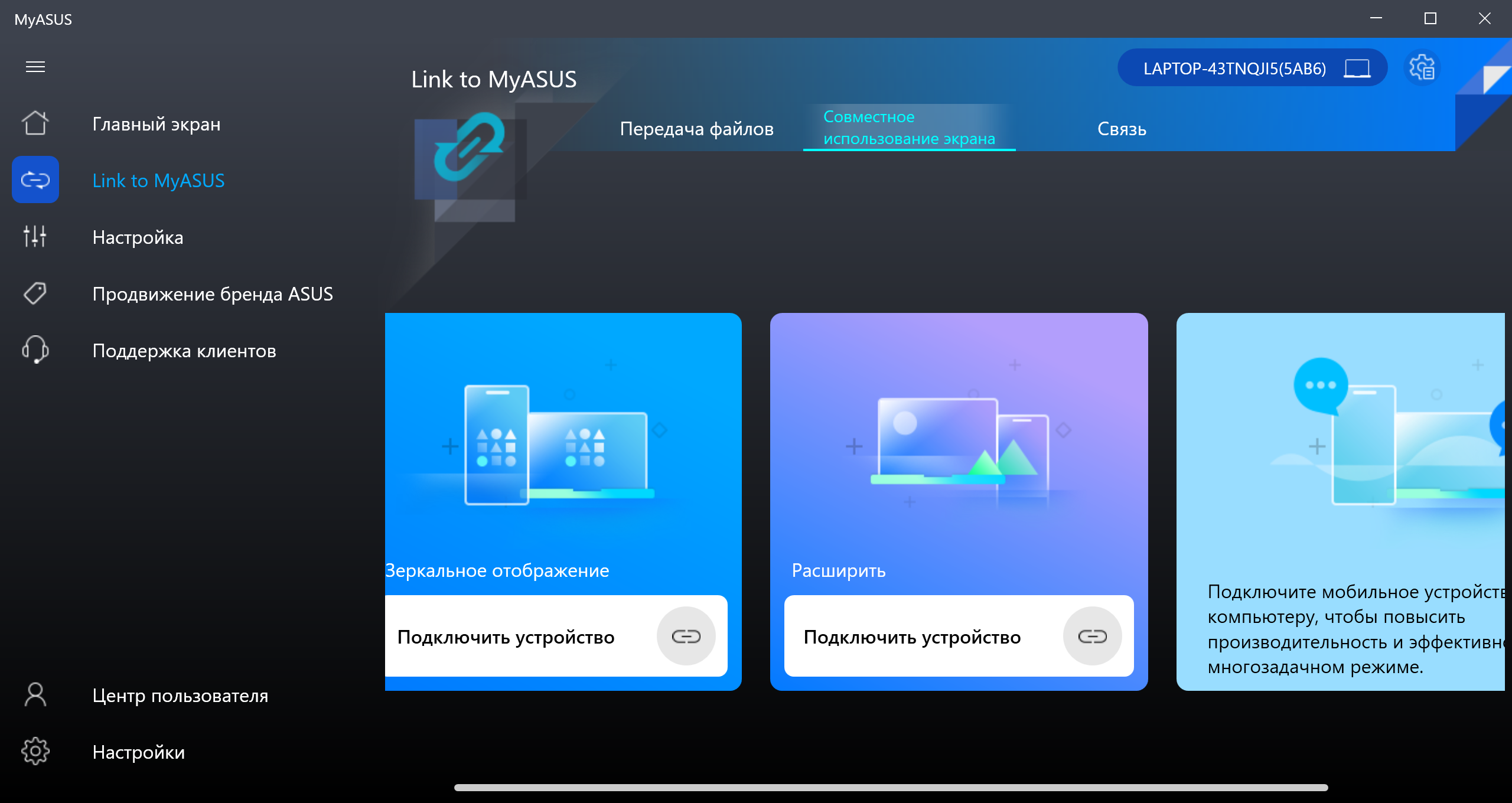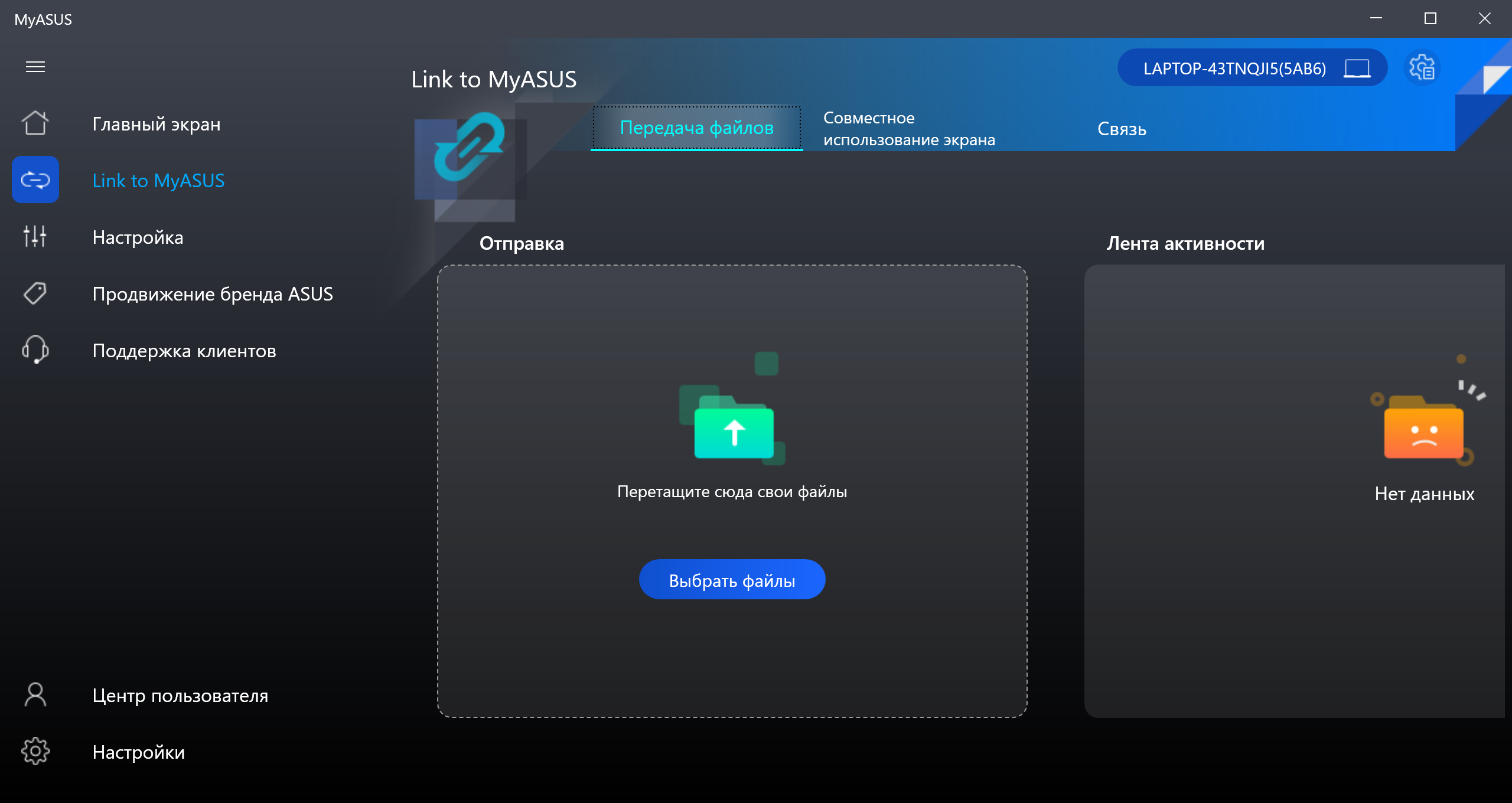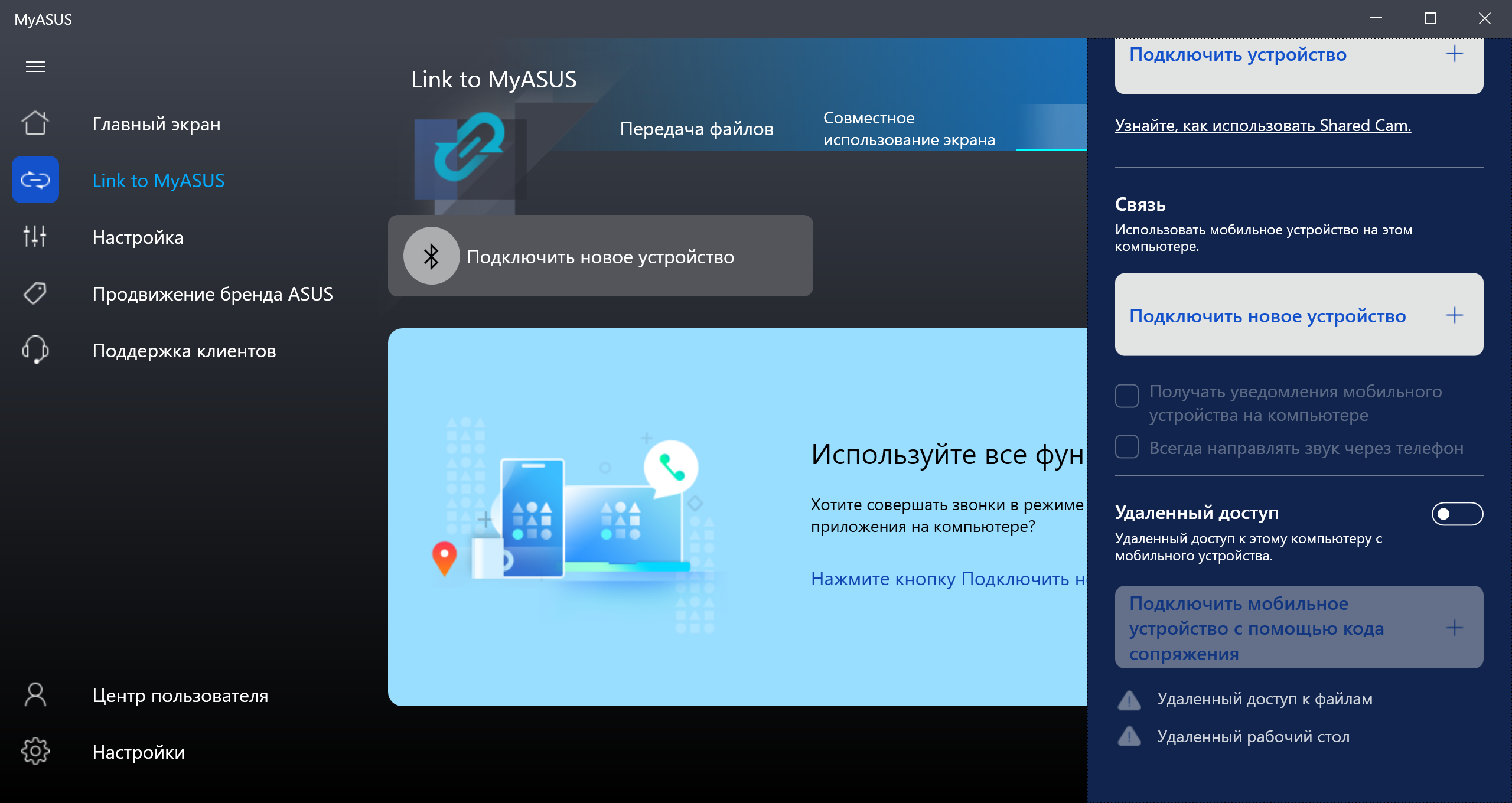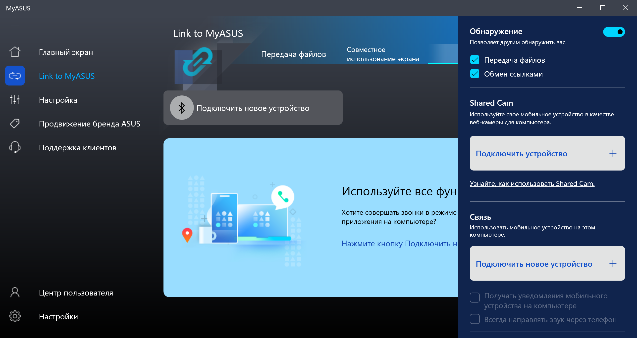 В последних версиях утилиты добавилась функция Link to MyAsus, которая позволяет упростить совместное использование ноутбука и смартфона (Android/iOS, любого производителя). Если установить сопряжение двух устройств, то можно удобно обмениваться файлами, совершать голосовые вызовы со смартфона, используя микрофоны и динамики ноутбука, отображать экран и оповещения мобильного устройства на экране ноутбука и даже использовать фронтальную камеру смартфона в качестве веб-камеры (очень актуально, учитывая традиционно паршивое качество встроенной вебки).
