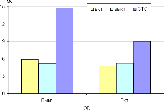 Время отклика зависит от частоты обновления и от того, включен ли разгон матрицы. В случае частоты обновления 120 Гц в фирменной утилите разгон можно выключить/включить (параметр Технология Overdrive — сократим до OD). Тогда как при частоте обновления 60 Гц разгон всегда выключен. Диаграмма ниже показывает, как меняется время включения и выключения при переходе черный-белый-черный (столбики «вкл.» и «выкл.»), а также среднее суммарное время для переходов между полутонами (столбики «GTG») в случае частоты обновления 120 Гц с выключенным и включенным разгоном: