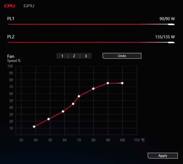 Основных профилей здесь три: Silent, Performance и Turbo (с очевидным увеличением в этом ряду уровня шума и производительности). Подробно их работу мы рассмотрим в разделе тестирования под нагрузкой. Для быстрого циклического перебора профилей можно нажимать сочетание клавиш Fn+F5. Профиль Manual позволяет вручную построить кривую реакции кулеров на нагрев CPU/GPU (в процентах), а заодно дополнительно подразогнать видеокарту (до +200 МГц) и ее память (до +300 МГц). Также предлагается возможность снизить лимиты потребления процессора, PL1 и PL2, что, впрочем, никак не скажется на шуме — система охлаждения все равно не взревывает при подаче нагрузки, когда процессор работает с динамическим разгоном. Заметим, что среди информации по кулерам утилита выводит ориентировочный уровень шума ноутбука в децибелах, и практика показала, что он очень неплохо соответствует результатам аппаратных измерений, сделанных с помощью шумомера.