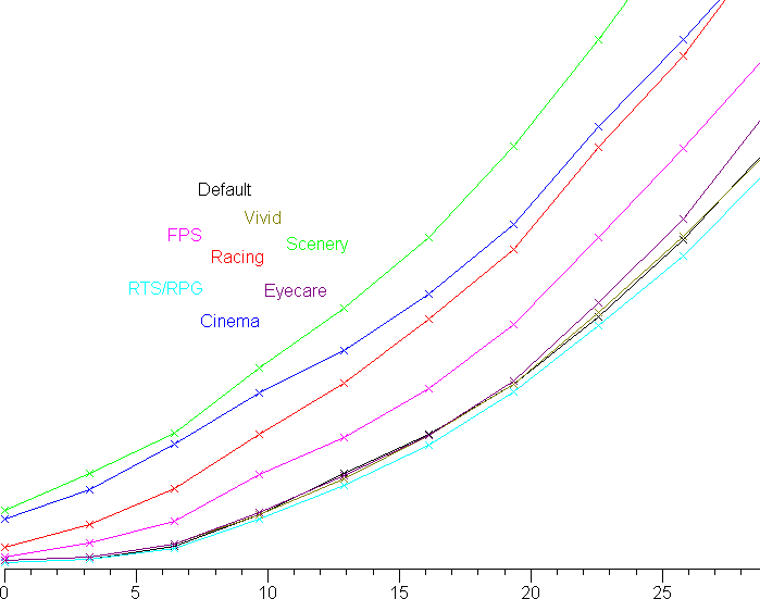 В любом случае матрица быстрая. После разгона на фронтах некоторых переходов появляются всплески яркости с не очень большой амплитудой (графики для перехода между оттенками серого 20% и 40% по численному значению цвета оттенка, яркость — вертикальная ось, время — горизонтальная ось):