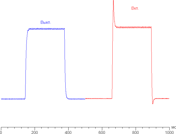 Посмотрим, хватит ли такой скорости матрицы для вывода изображения с частотой 120 Гц. Приведем зависимость яркости от времени при чередовании белого и черного кадра при 120 Гц кадровой частоты с выключенным и включенным разгоном: