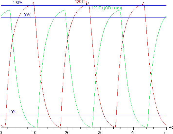Видно, что при 120 Гц максимальная яркость белого кадра выше 90% от уровня белого (в случае разгона даже выше 100%), а минимальная яркость черного кадра снижается до уровня черного. Итоговый размах амплитуды существенно больше 80% от яркости белого. То есть согласно этому формальному критерию скорости матрицы достаточно для полноценного вывода изображения с кадровой частотой 120 Гц.
