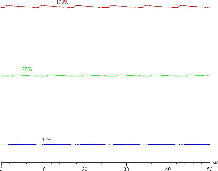 На любом уровне яркости значимая модуляция подсветки отсутствует, поэтому нет и никакого мерцания экрана. В доказательство приведем графики зависимости яркости (вертикальная ось) от времени (горизонтальная ось) при различных значениях настройки яркости: