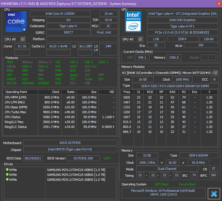 | Процессор | Intel Core i9-11900H (8 ядер/16 потоков, 2,5/4,9 ГГц, 35—45 Вт) | |