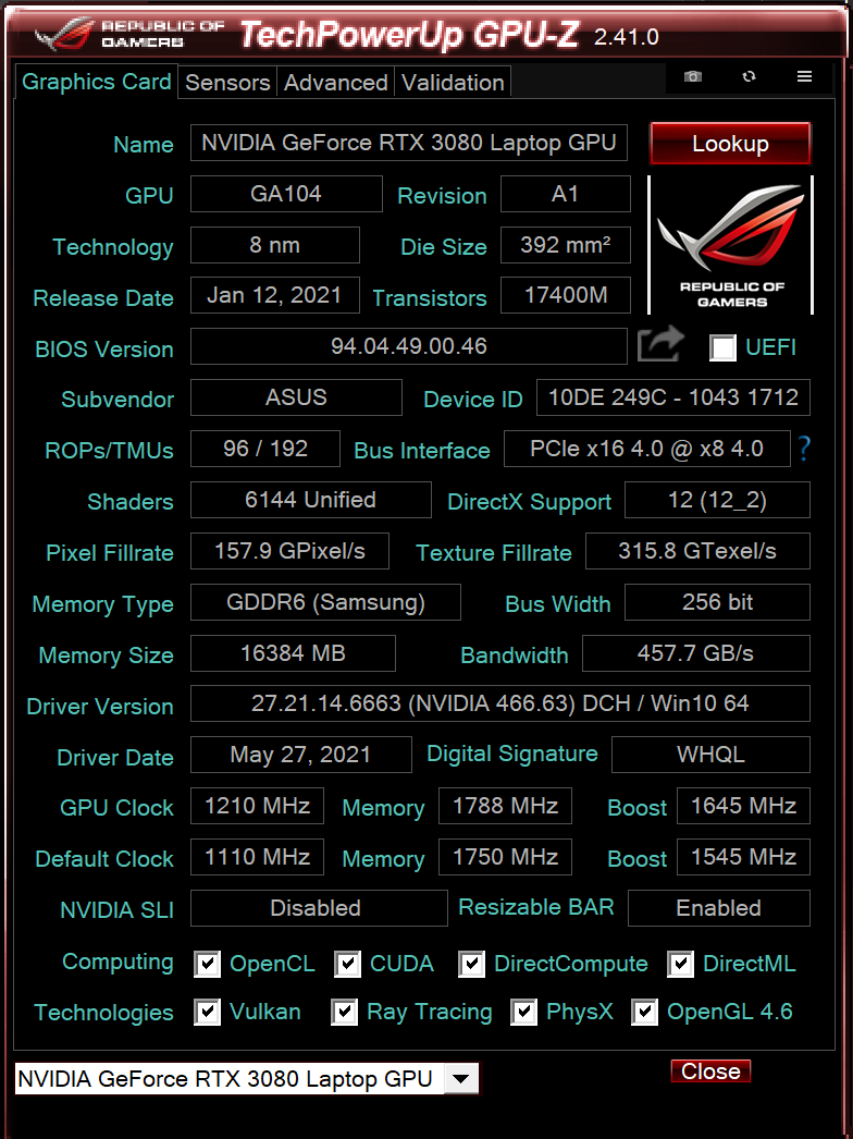 Тестирование ноутбука в играх мы проведем с использованием его дискретной видеокарты Nvidia GeForce RTX 3080 Laptop. Напомним, что мобильные видеокарты линейки GeForce RTX 30, основанные на архитектуре Ampere, были анонсированы в начале 2021 года. Nvidia заявляет для этих моделей только диапазон возможных рабочих характеристик, а параметры работы видеокарты в конкретном ноутбуке определяются его создателем. Так, на сайте Nvidia для GeForce RTX 3080 Laptop заявлены Boost-частоты от 1245 до 1710 МГц и потребление 80—150 Вт (и более). Asus на своем сайте приводит цифры 1645 МГц и 125 Вт (с динамическим разгоном до 140 Вт) — традиционно, мы под нагрузкой наблюдали именно такое потребление, а вот подобная частота была достижима лишь в редких пиках (подробнее см. в разделе тестирования под нагрузкой). Также у карты 16 ГБ памяти GDDR6 с 256-битной шиной — это максимальный возможный объем на сегодняшний день. В общем, безусловно топовое решение.