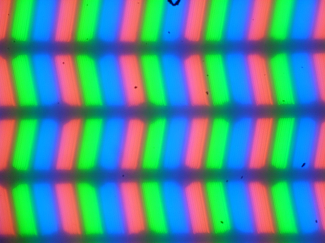 В этом ноутбуке используется матрица типа IPS. Микрофотографии демонстрируют типичную для IPS структуру субпикселей (черные точки — это пыль на матрице фотоаппарата):