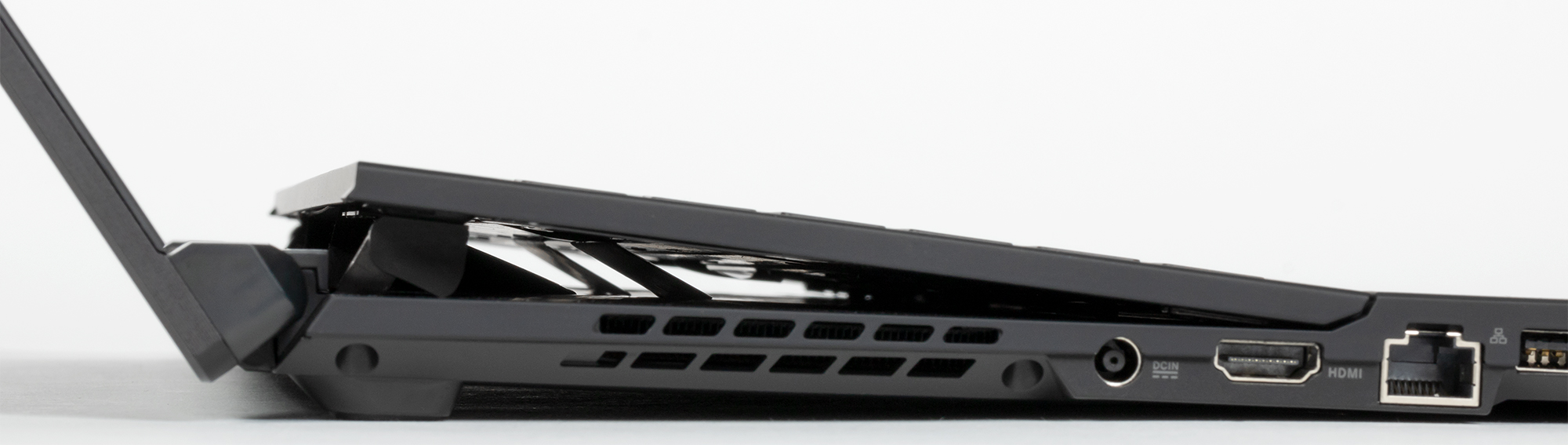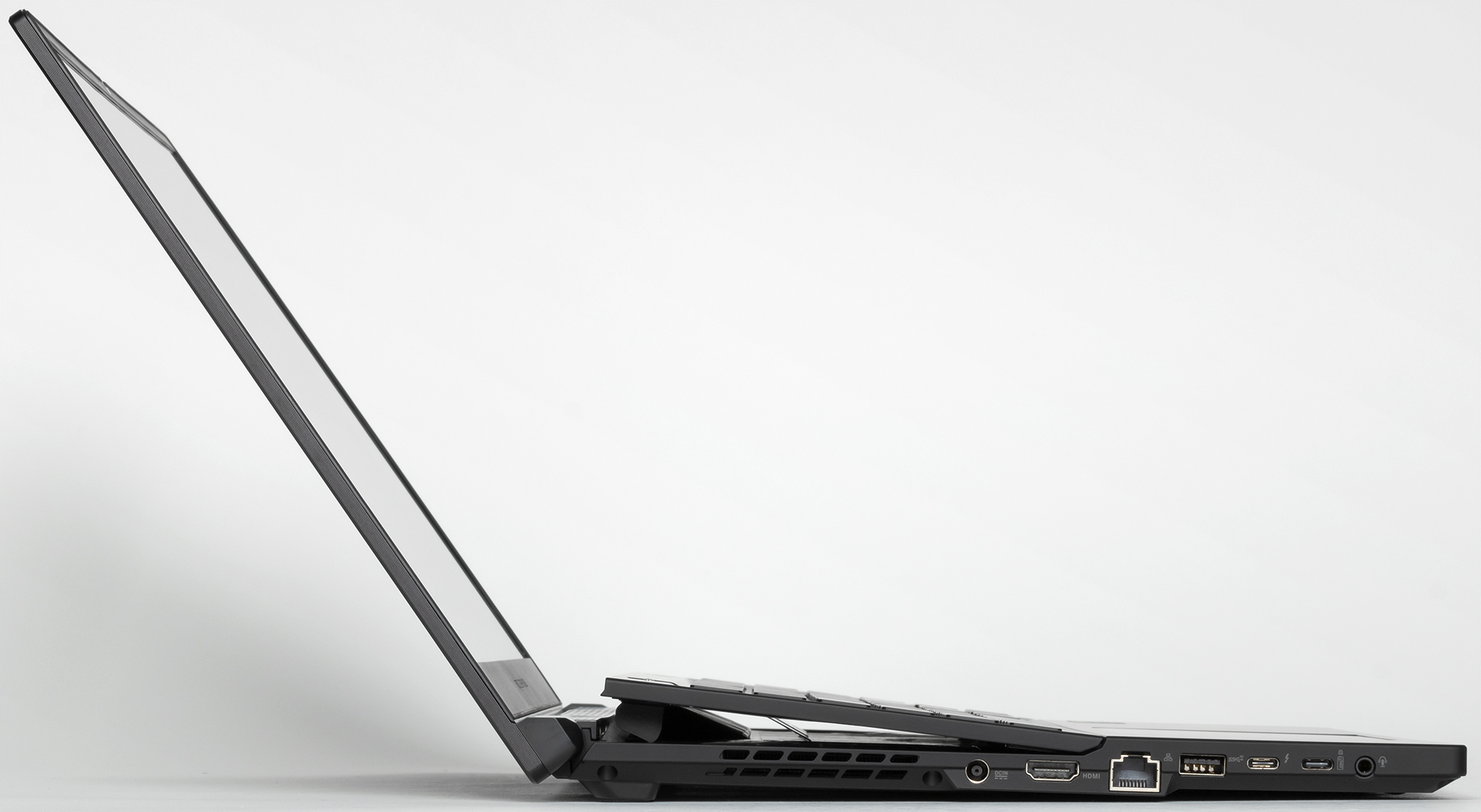 Как только крышка откидывается, дальняя часть рабочей поверхности (с клавиатурой) поднимается на угол около 5° от плоскости основания. Это служит двум целям: задняя часть клавиатуры оказывается чуть приподнята, формируя более комфортный рельеф для набора текста, а через щель между основанием корпуса и приподнятой частью кулеры могут дополнительно забирать холодный воздух. Механизм подъема работает автоматически и жестко сцеплен с механизмом распахивания крышки. Отрегулировать наклон клавиатуры нельзя, закрыть крышку, нажимая на клавиатуру, тоже нельзя. Приходится следить, чтобы ничего не попало в щель при закрытии крышки, но, в общем, проблем тут не больше, чем в случае «традиционного» ноутбука — в крайнем случае крышка просто не закроется.