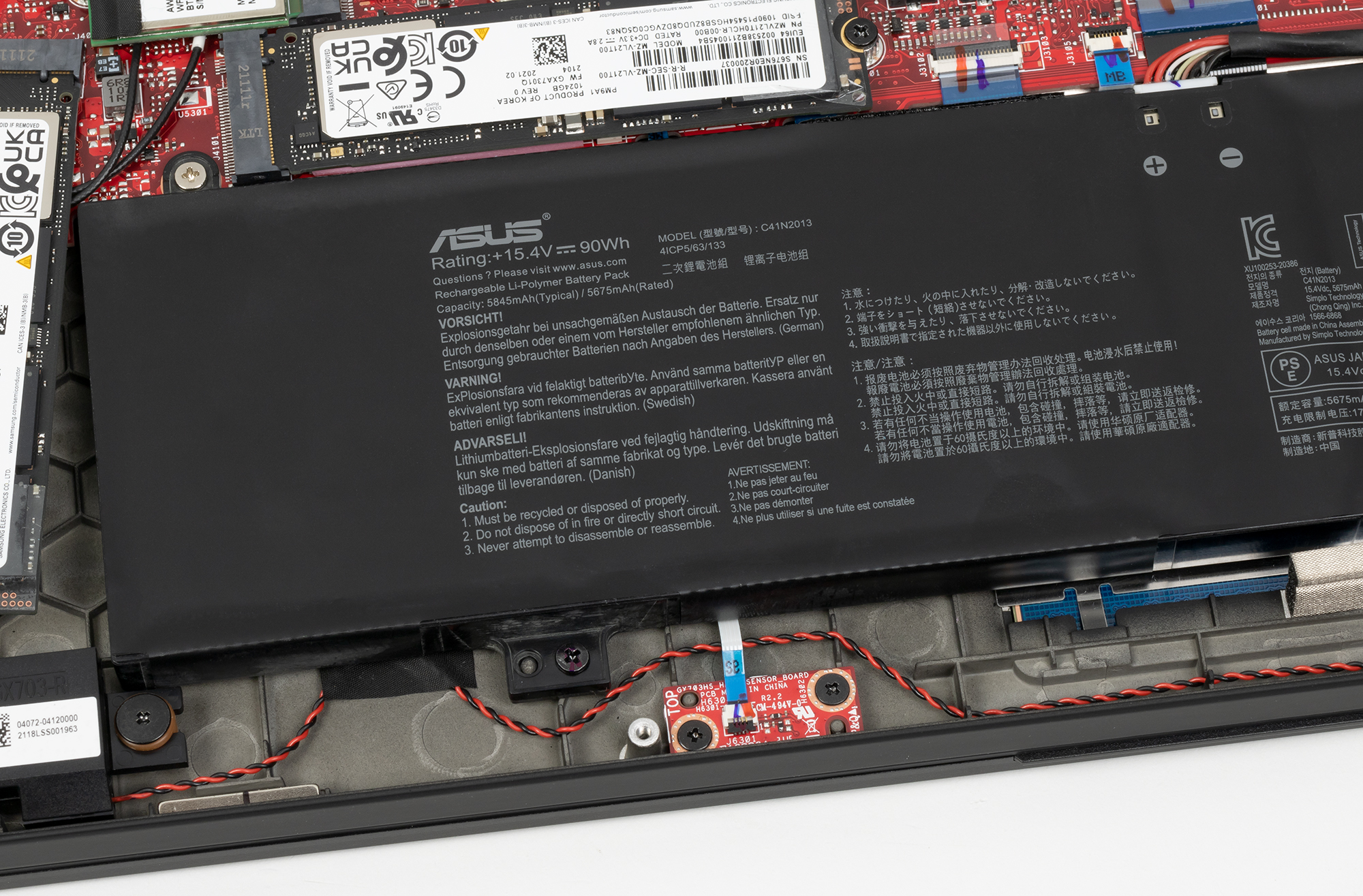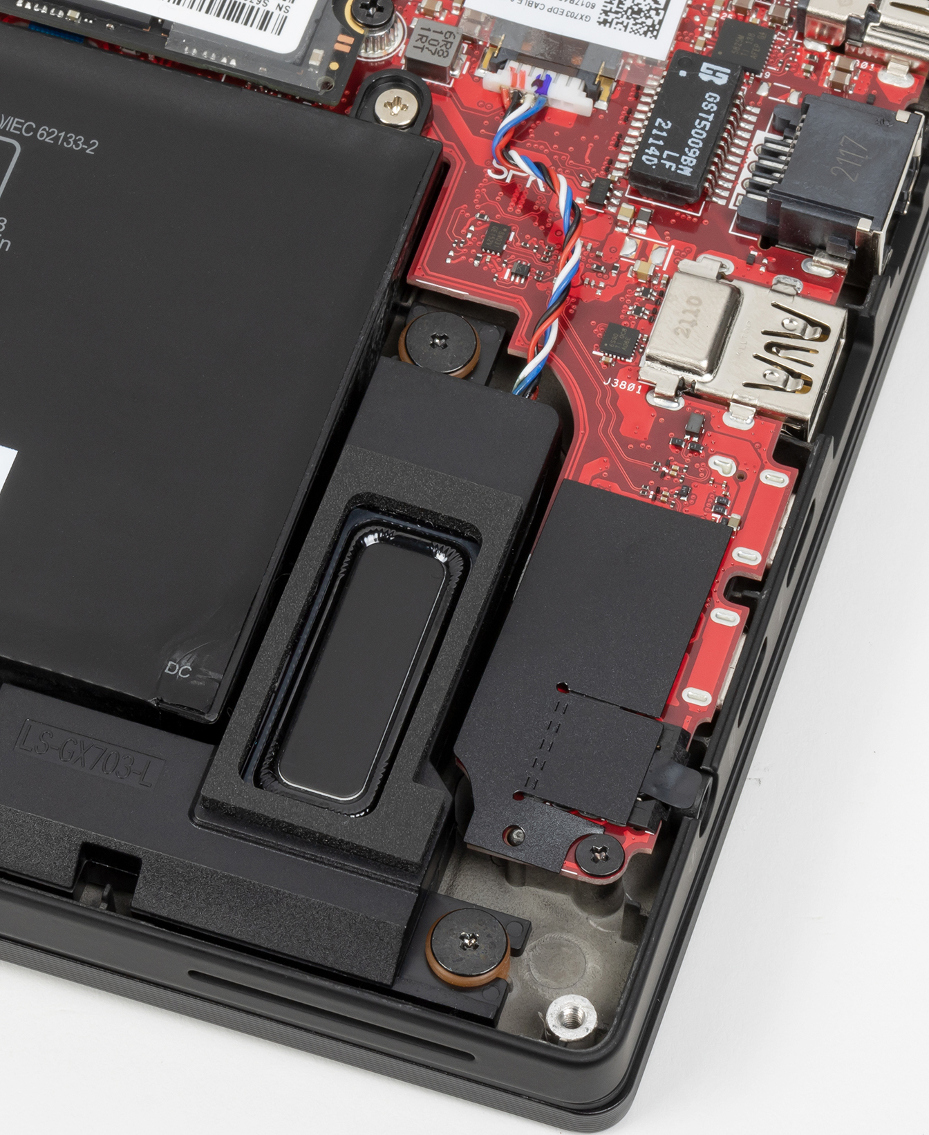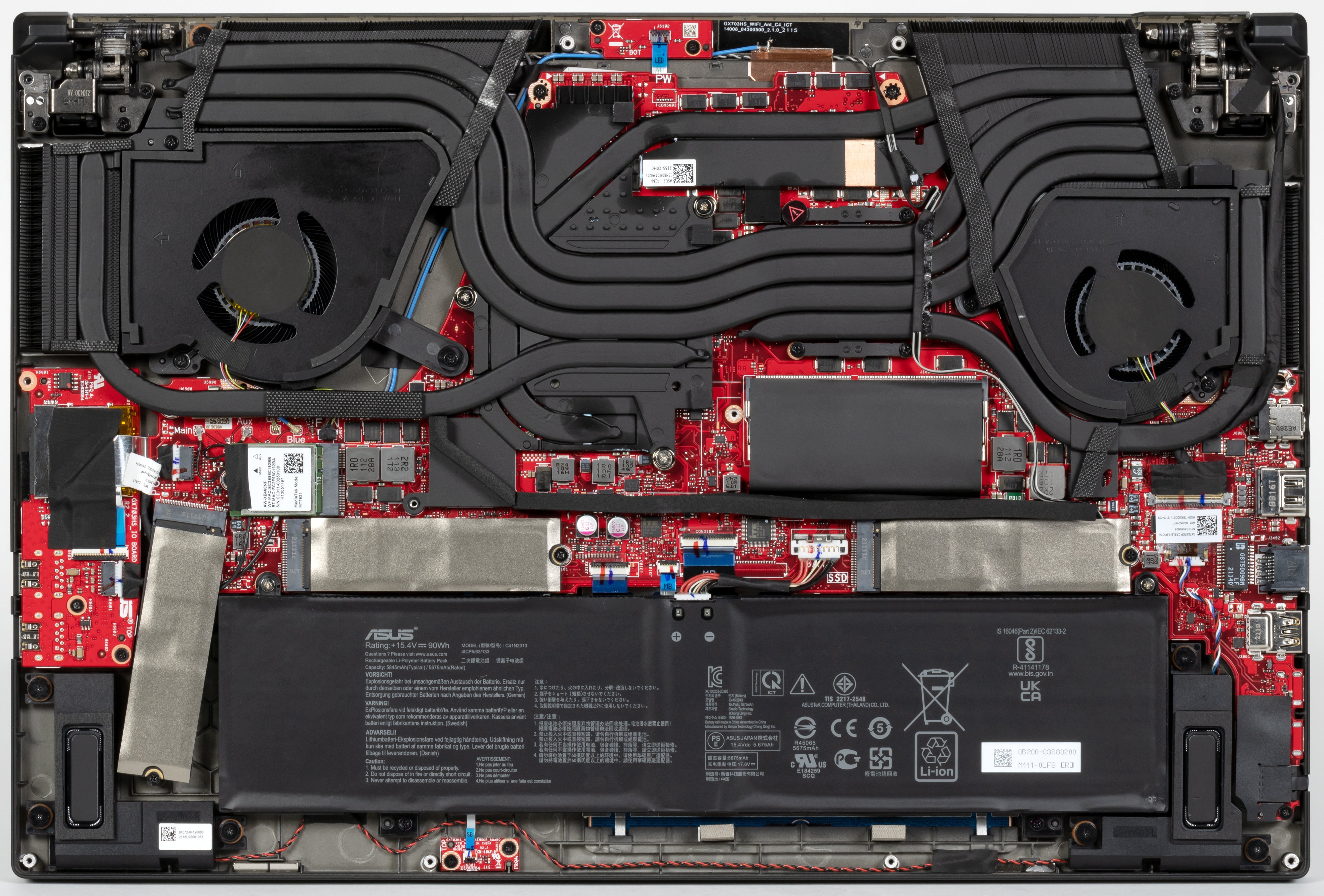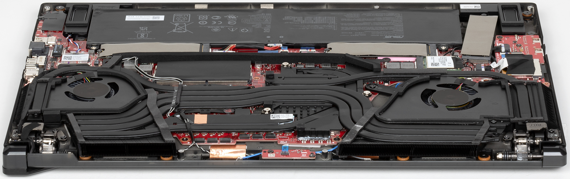 После снятия нижней крышки корпуса картина открывается вроде бы привычная, но есть нюансы. Во-первых, здесь аж три SSD-накопителя. Во-вторых, третий SSD размещен в горизонтальной плоскости под углом, чтобы влезть между дополнительной платкой с портами ввода-вывода и большой батареей. Смотрится забавно, обычно такая разводка не встречается (но обычно и три накопителя в ноутбуках не встречаются). Помимо этого открывается доступ к кулерам, аккумулятору, беспроводному адаптеру и единственному слоту для модуля памяти SO-DIMM. Заменой этого модуля можно получить максимальный доступный объем памяти в 48 ГБ.