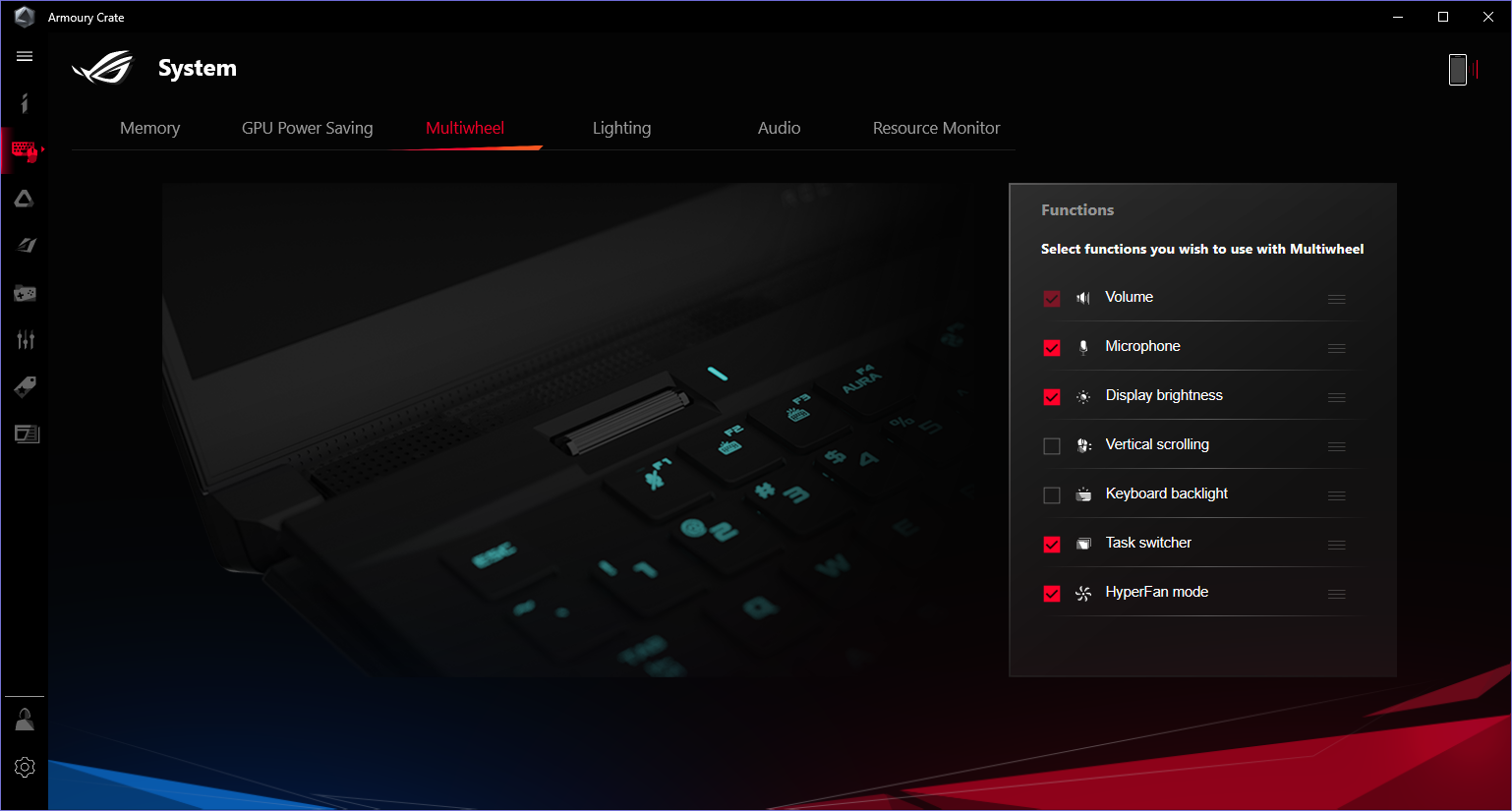Тем не менее, мы допускаем, что кому-то новый способ понравится, тем более что реализовано все максимально продуманно. В Armoury Crate можно отключить ненужные режимы (почему-то кроме регулировки громкости) и поменять их порядок в меню. Выбранный режим запоминается и сохраняется после перезагрузки, так что если у вас всего один предпочитаемый режим регулировки колесиком, будет очень удобно и вообще не нужно ни о чем вспоминать. На заблокированном экране продолжают работать, например, регулировка громкости (и отключение звука) или регулировка яркости экрана, а вот переключиться на другую функцию без логина нельзя. Светодиод рядом с колесиком ничего не иллюстрирует и просто светится в такт с клавиатурой (можно его отключить), привлекая внимание к новому элементу управления и помогая найти его в темноте.
