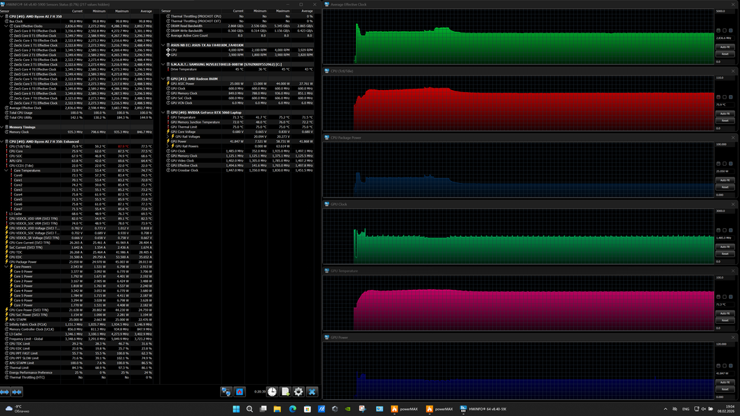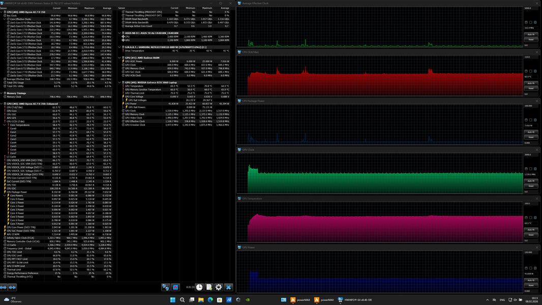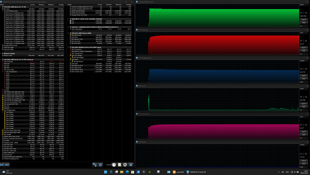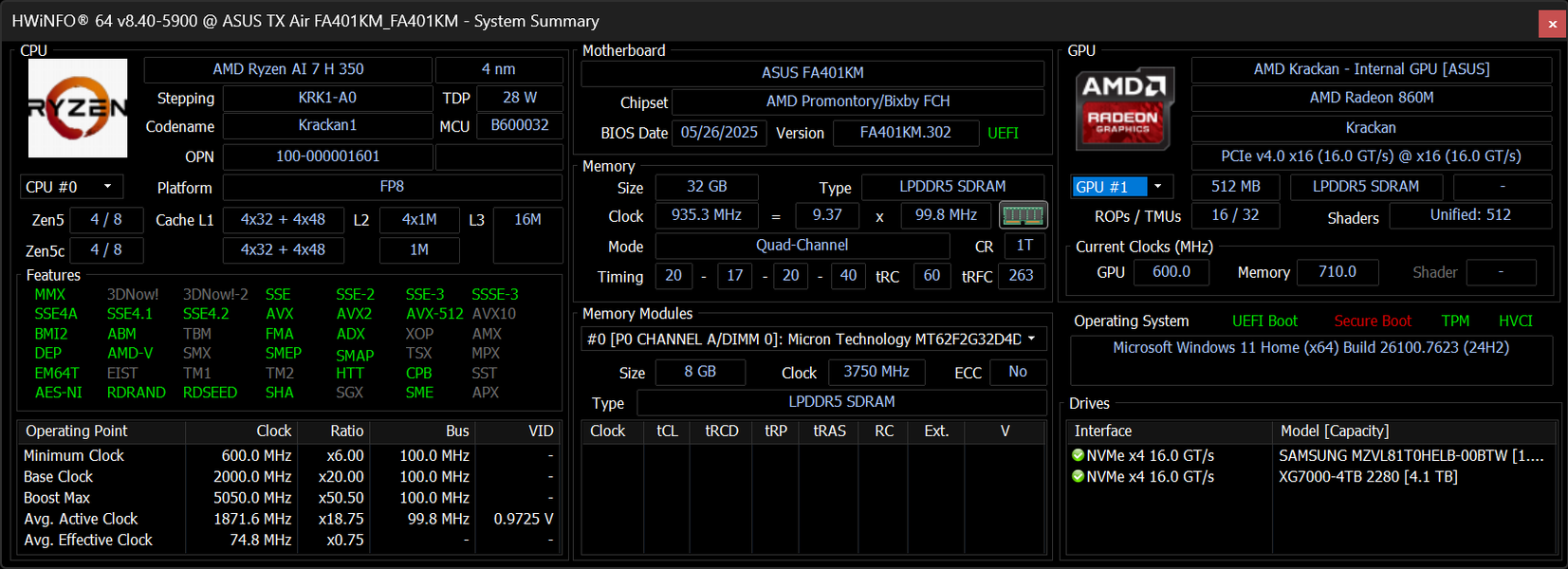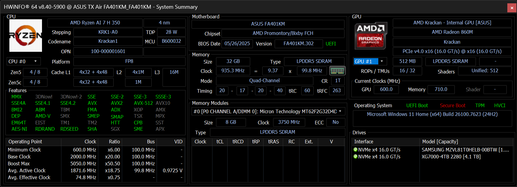 | Процессор | AMD Ryzen AI 7 H 350, 8 двухпотоковых ядер: 4 × Zen 5 (2—5 ГГц) + 4 × Zen 5c (2—3,5 ГГц); TDP 28 Вт (15—54 Вт); Tjmax 100 °C; NPU 50 TOPS | |