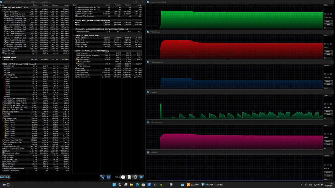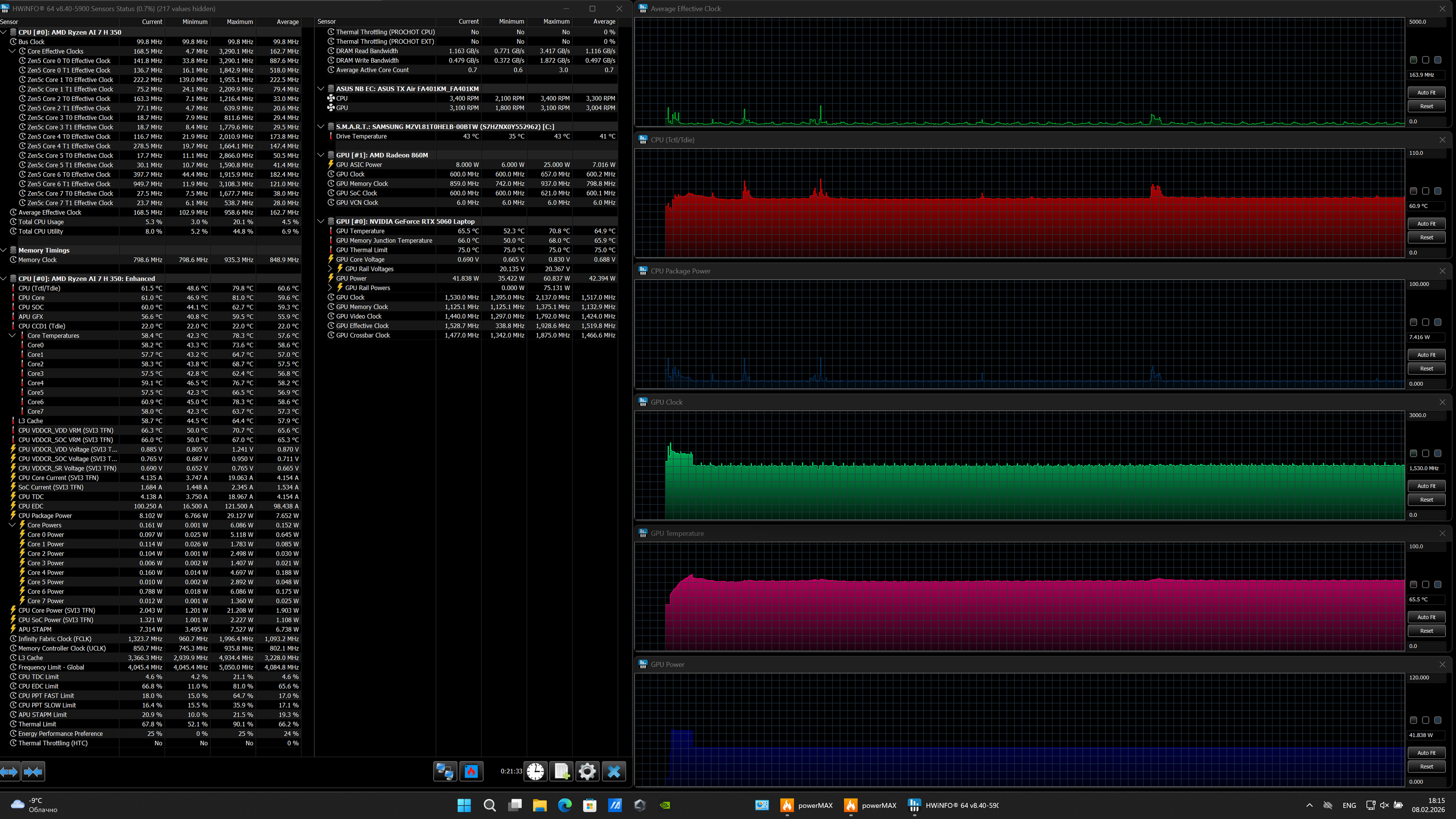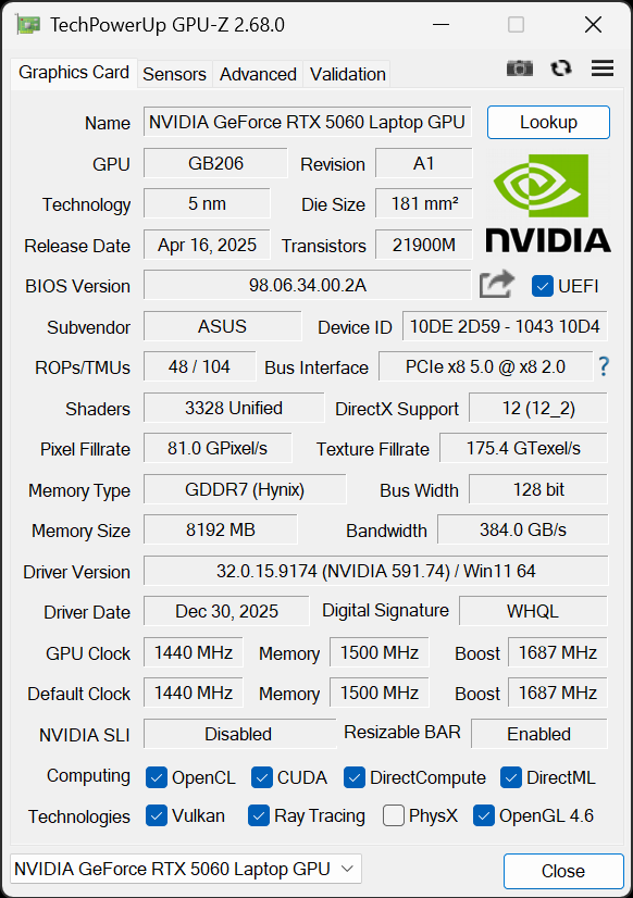 Asus TX Air FA401K располагает интегрированным видеоускорителем AMD Radeon 860M (до 3 ГГц), но для игр и приложений, умеющих задействовать дискретную графику, установлена видеокарта Nvidia GeForce RTX 5060 Laptop. Ее низкоуровневые параметры можно найти на скриншоте приложения GPU-Z.